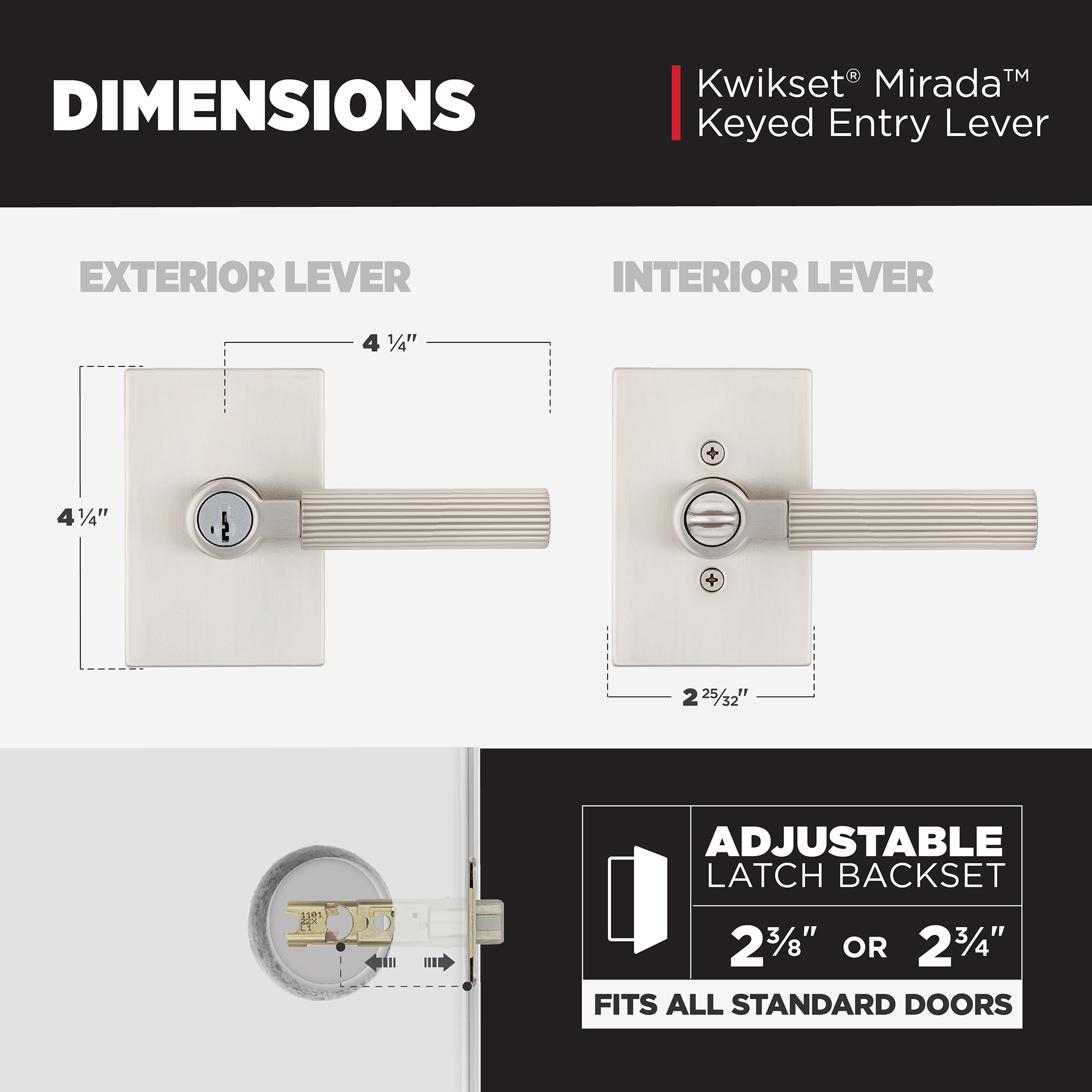 - Fits Standard Doors: Fits standard size doors 1-3/8" to 1-3/4" thick, latch backset adjusts to either 2-3/8" or 2-3/4" by sliding the adjustment pin during installation