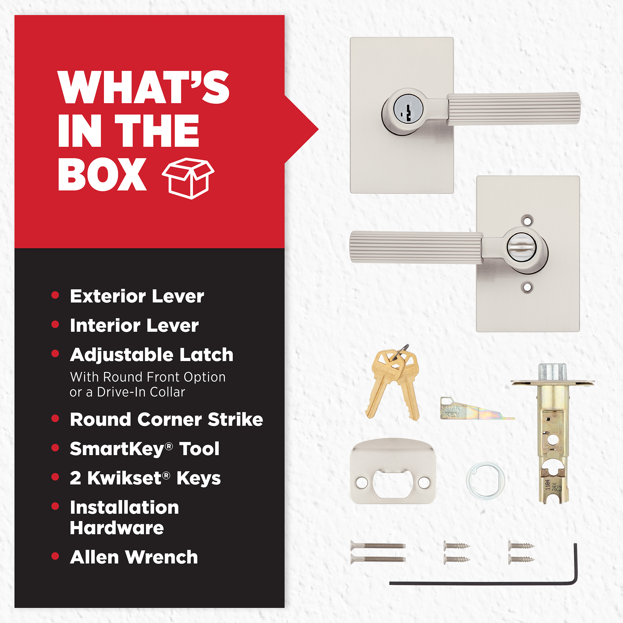 - Box Includes: Entry lever, Adjustable Latch with round front option or a drive-in collar, round corner strike, SmartKey tool, 2 Kwikset keys, installation hardware and Allen wrench