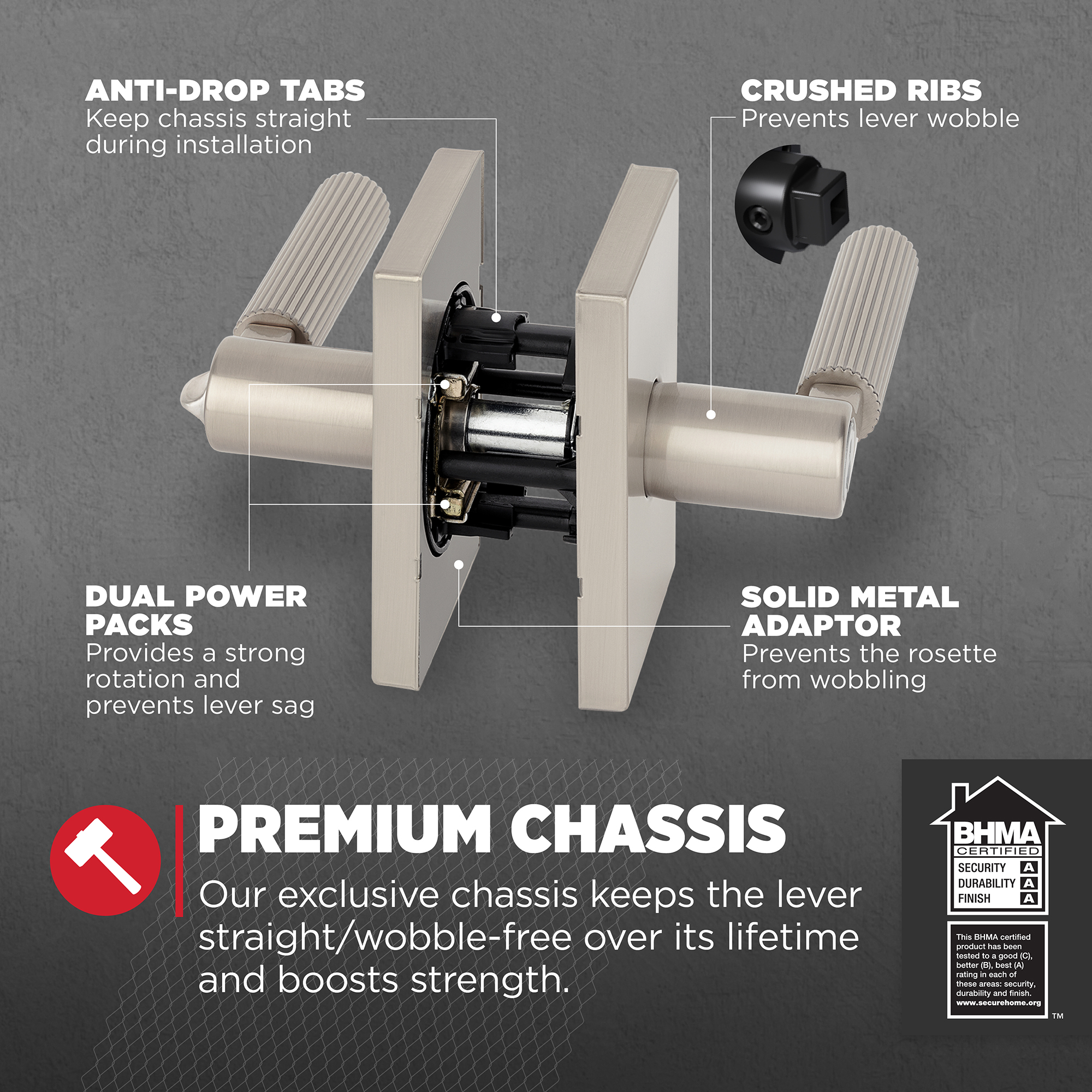 - Premium Chassis: Kwikset’s exclusive chassis uses dual compression springs, keeping the lever straight and wobble-free over the lifetime of the product and enhancing its strength and rotational feel