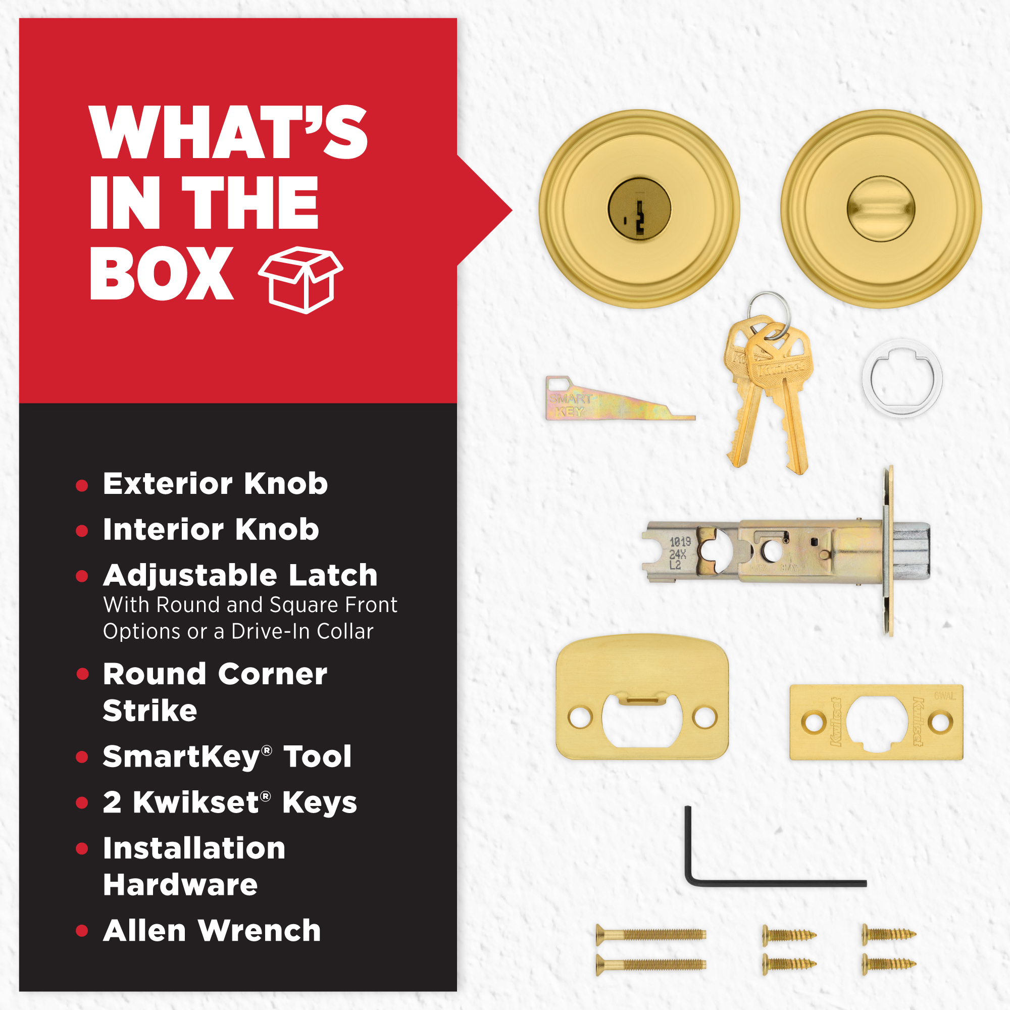 - Box Includes: Entry knob, Adjustable Latch with round front option or a drive-in collar, round corner strike, SmartKey tool, 2 Kwikset keys, installation hardware and Allen wrench