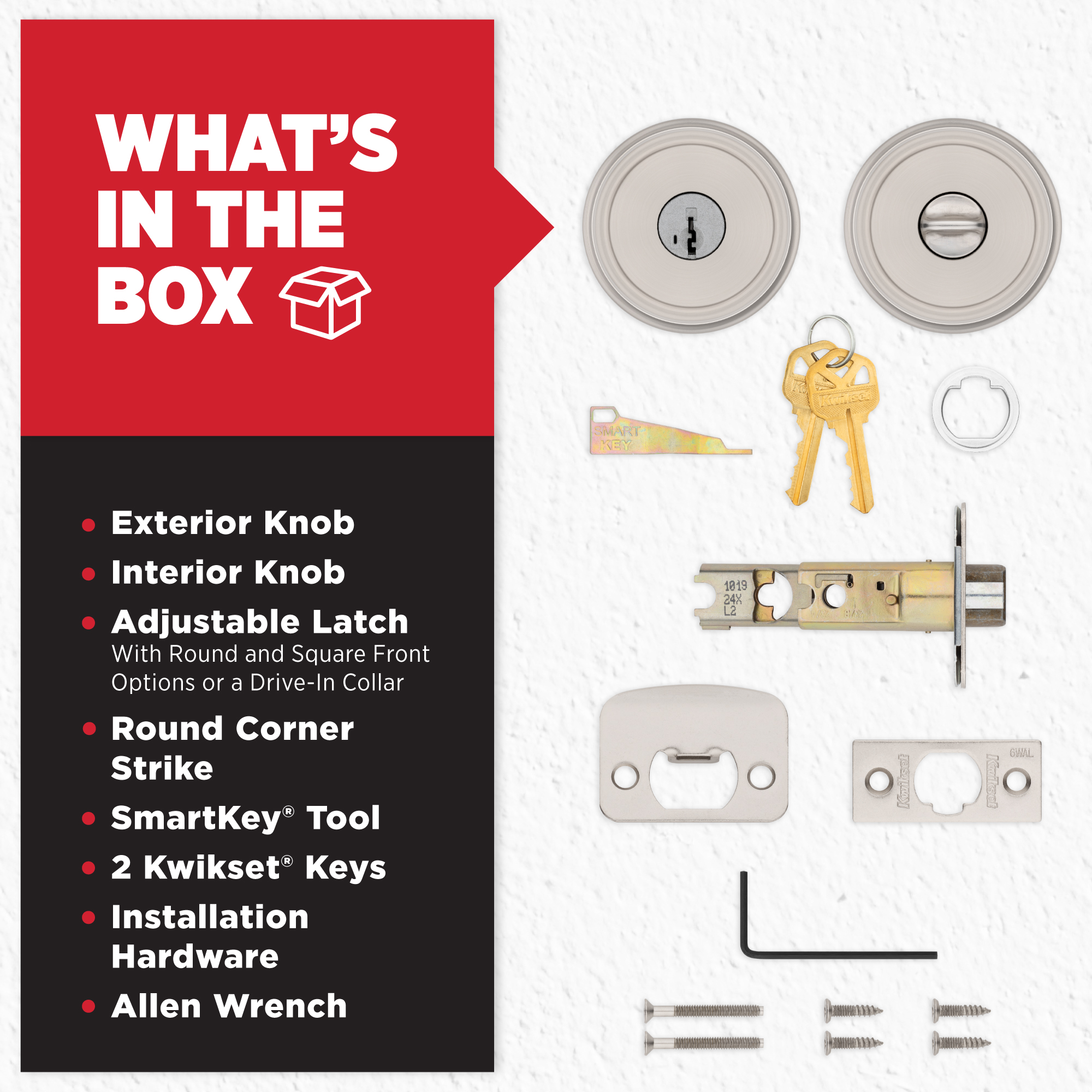 SmartKey Security™ re-key technology is compatible with Kwikset (KW1) keyway or (SC1) keyway options