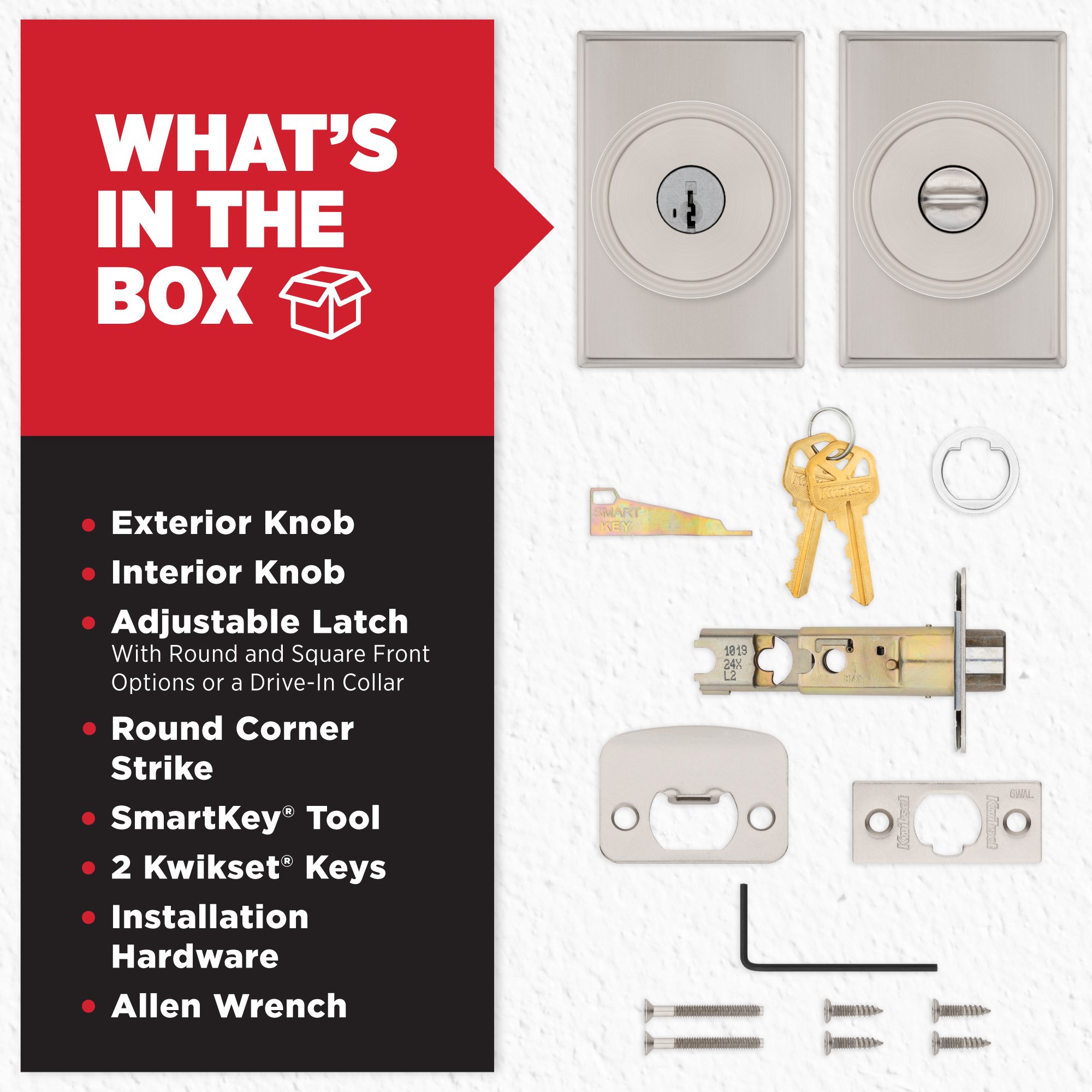 SmartKey Security™ re-key technology is compatible with Kwikset (KW1) keyway or (SC1) keyway options