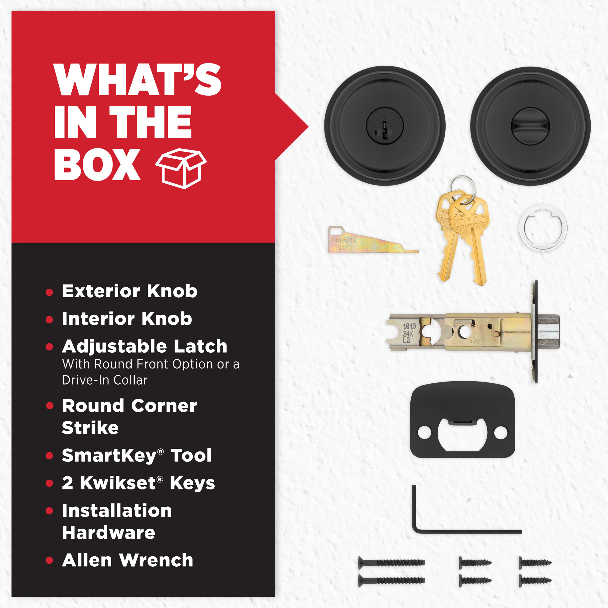 - Box Includes: Entry knob, Adjustable Latch with round front option or a drive-in collar, round corner strike, SmartKey tool, 2 Kwikset keys, installation hardware and Allen wrench