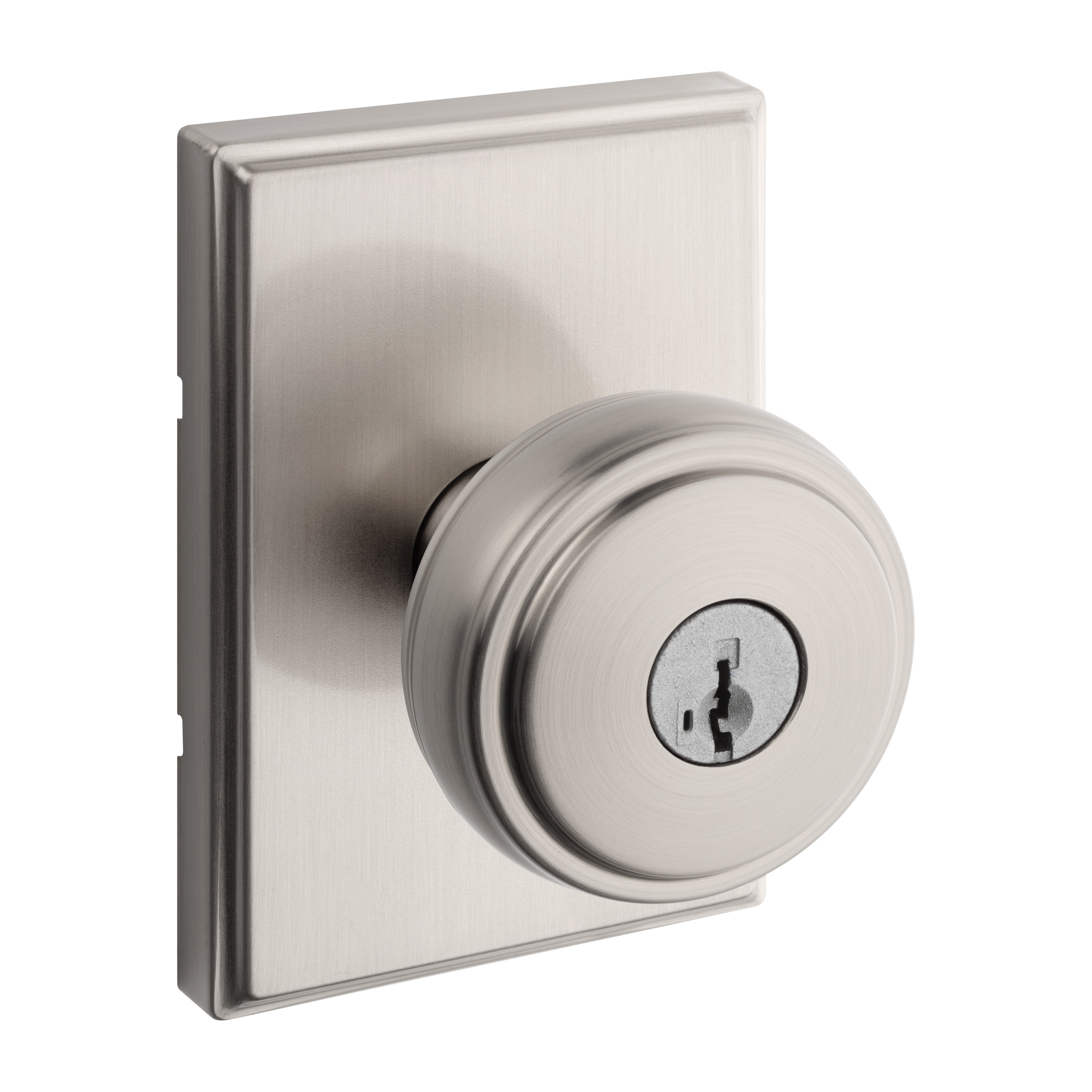 Sora Keyed Entry Knob w/ Rectangular Rose featuring SmartKey Security™ in Satin Nickel