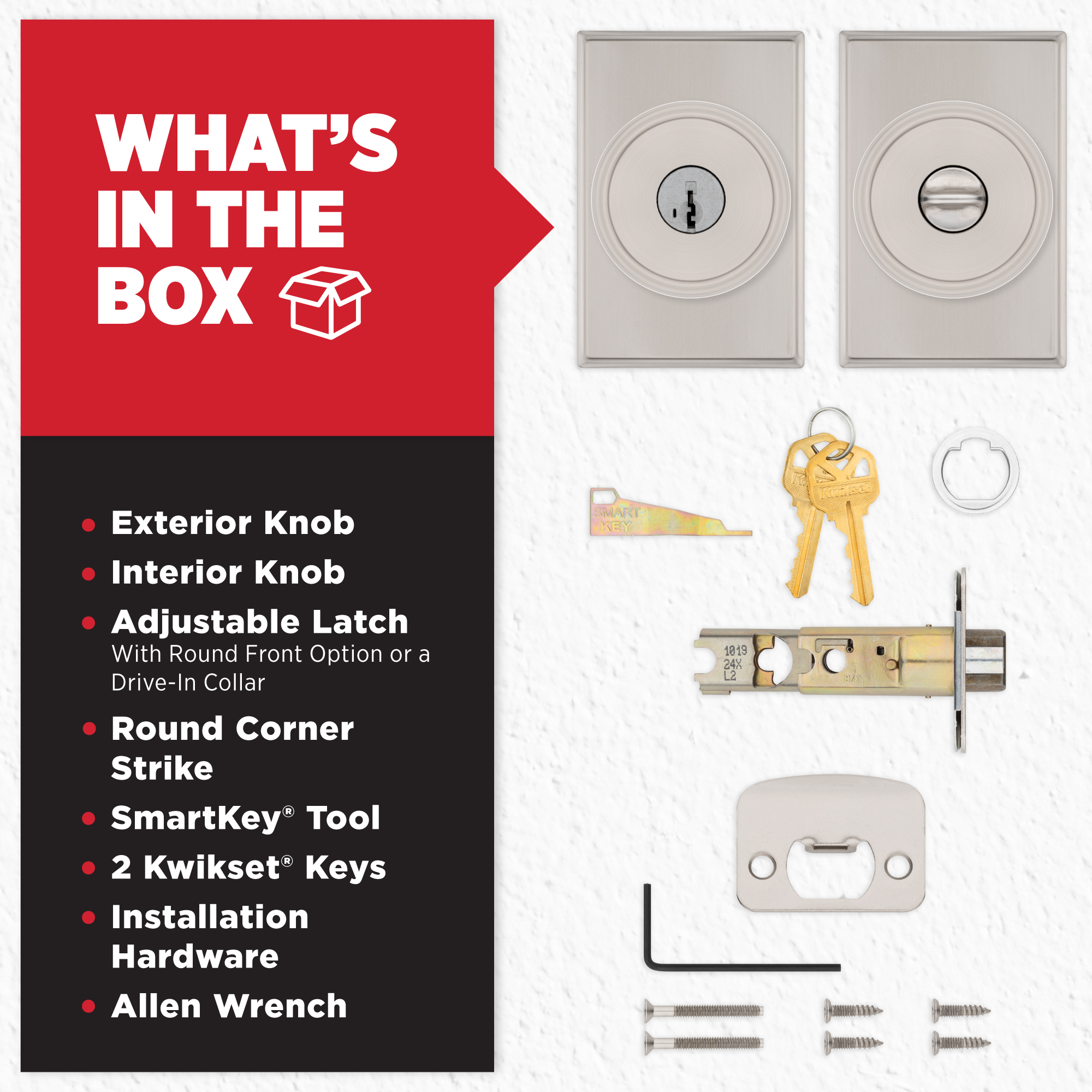 - Box Includes: Entry knob, Adjustable Latch with round front option or a drive-in collar, round corner strike, SmartKey tool, 2 Kwikset keys, installation hardware and Allen wrench