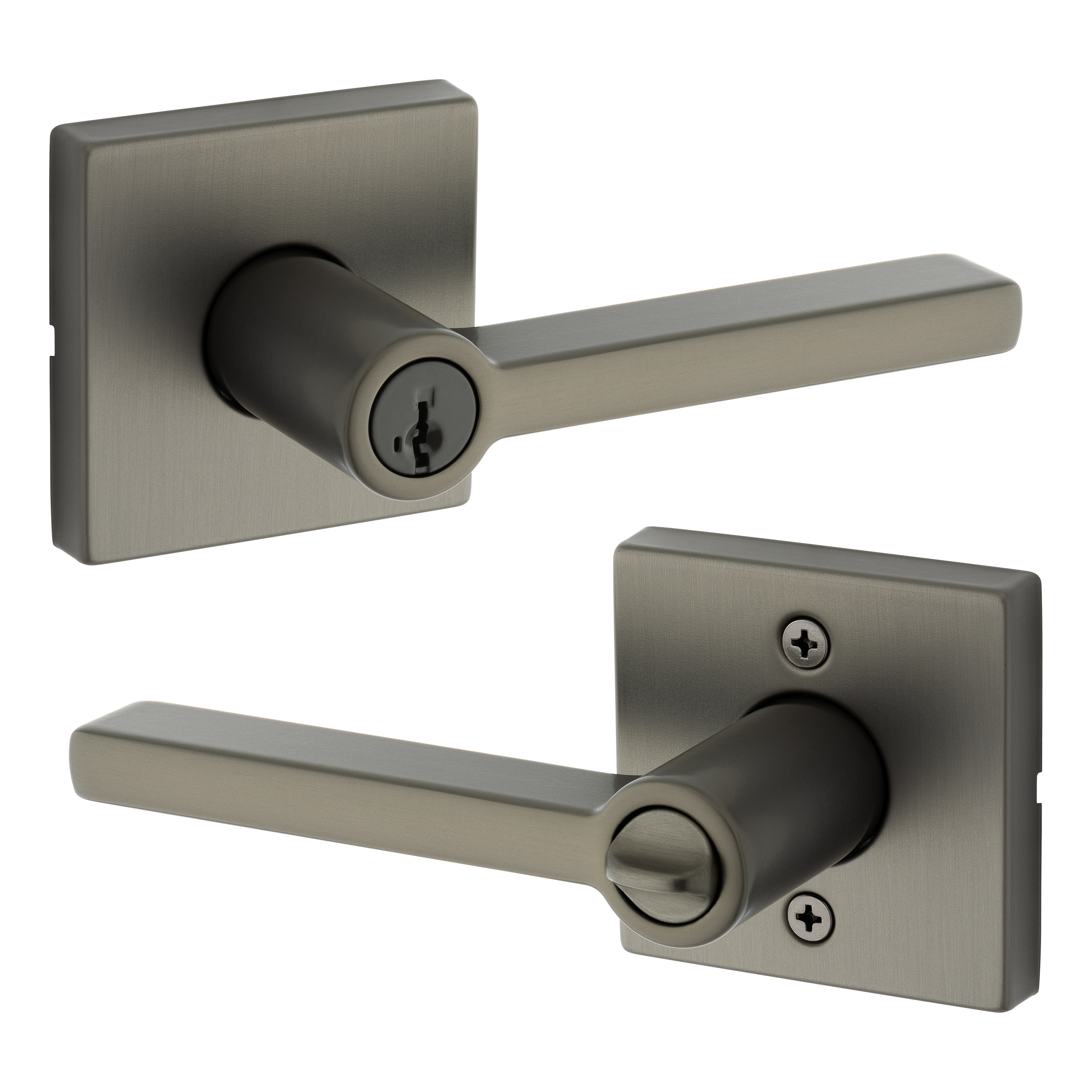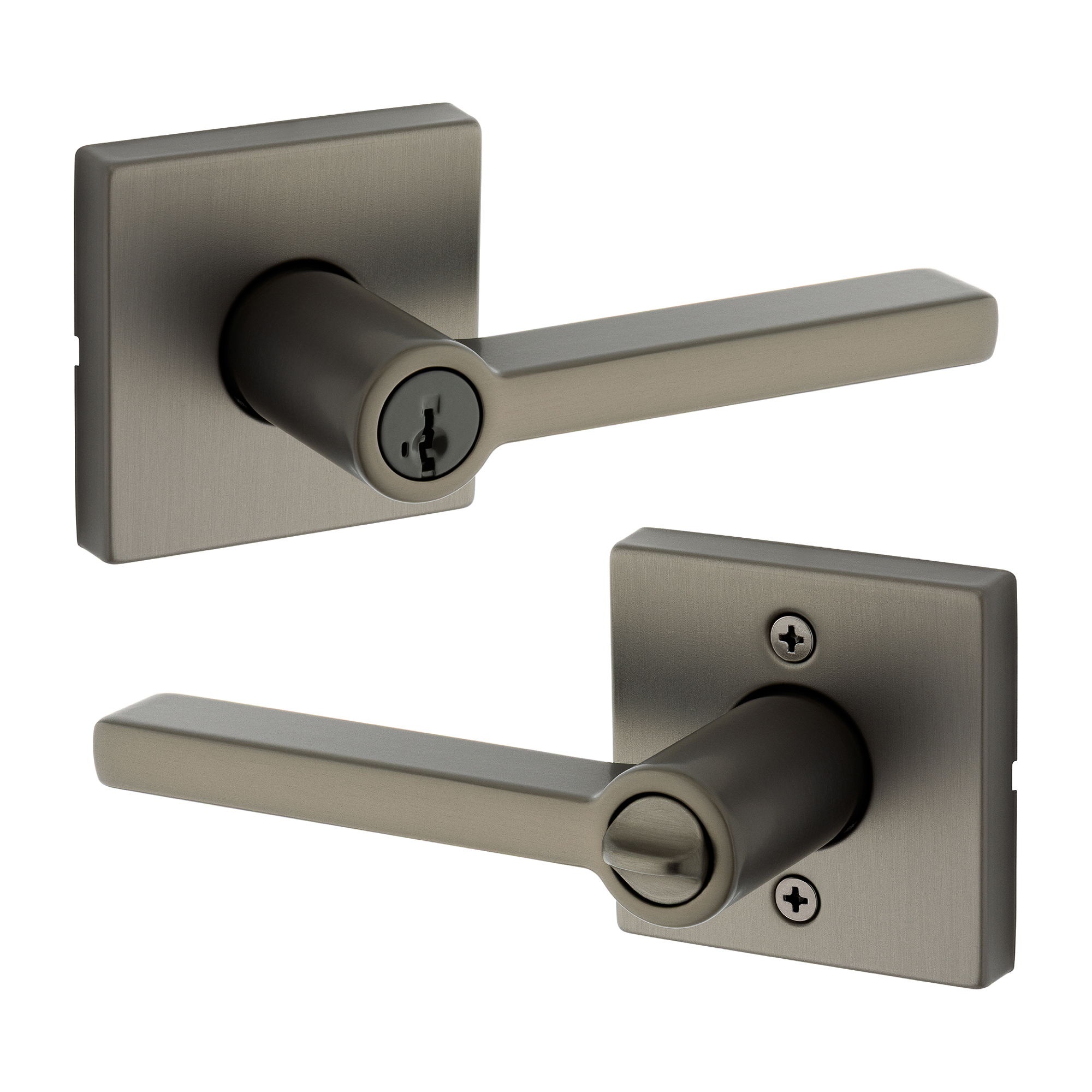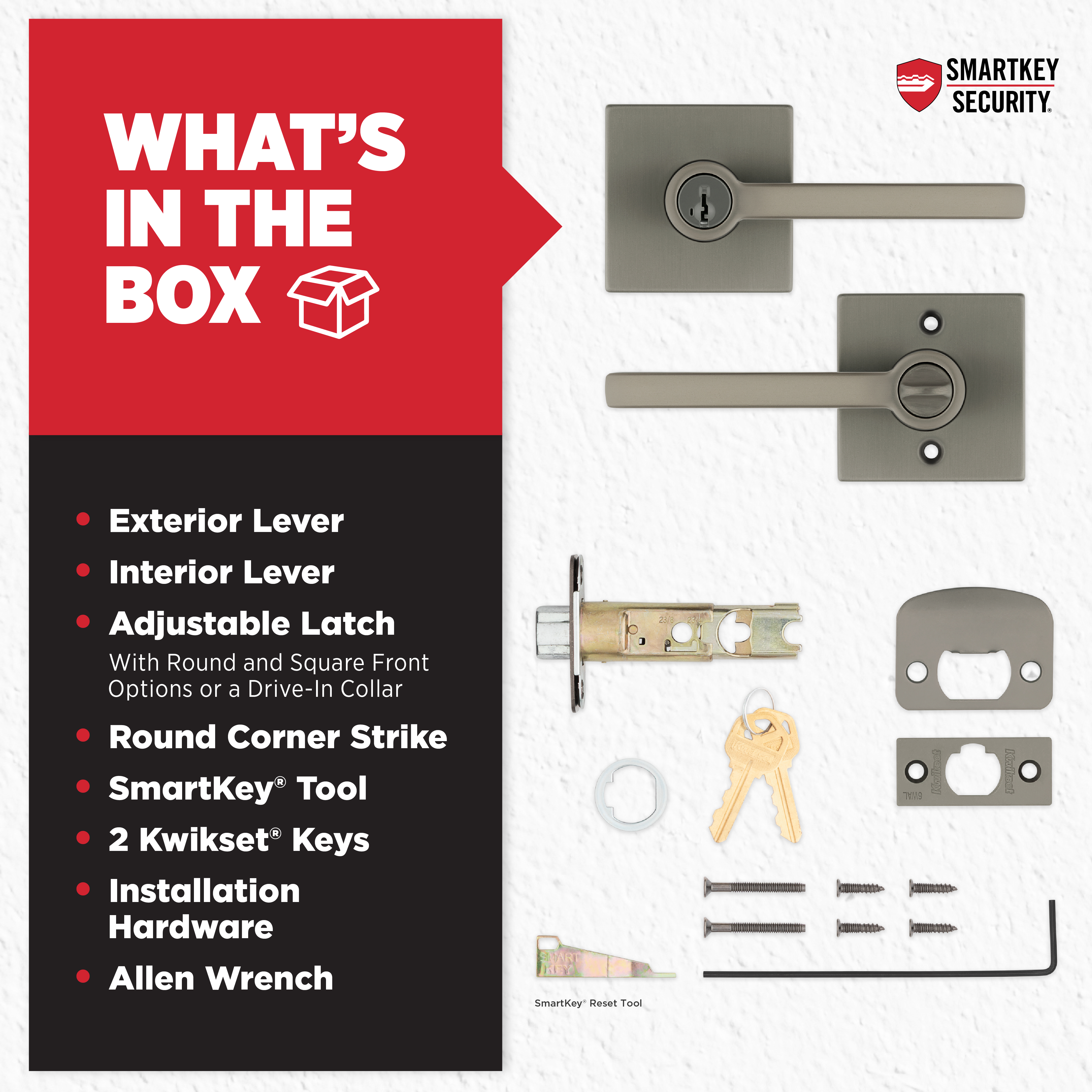 - Box Includes Entry lever, adjustable latch with round and square front options or a drive-in collar, round corner strike, SmartKey® tool, 2 Kwikset® keys, installation hardware and Allen wrench