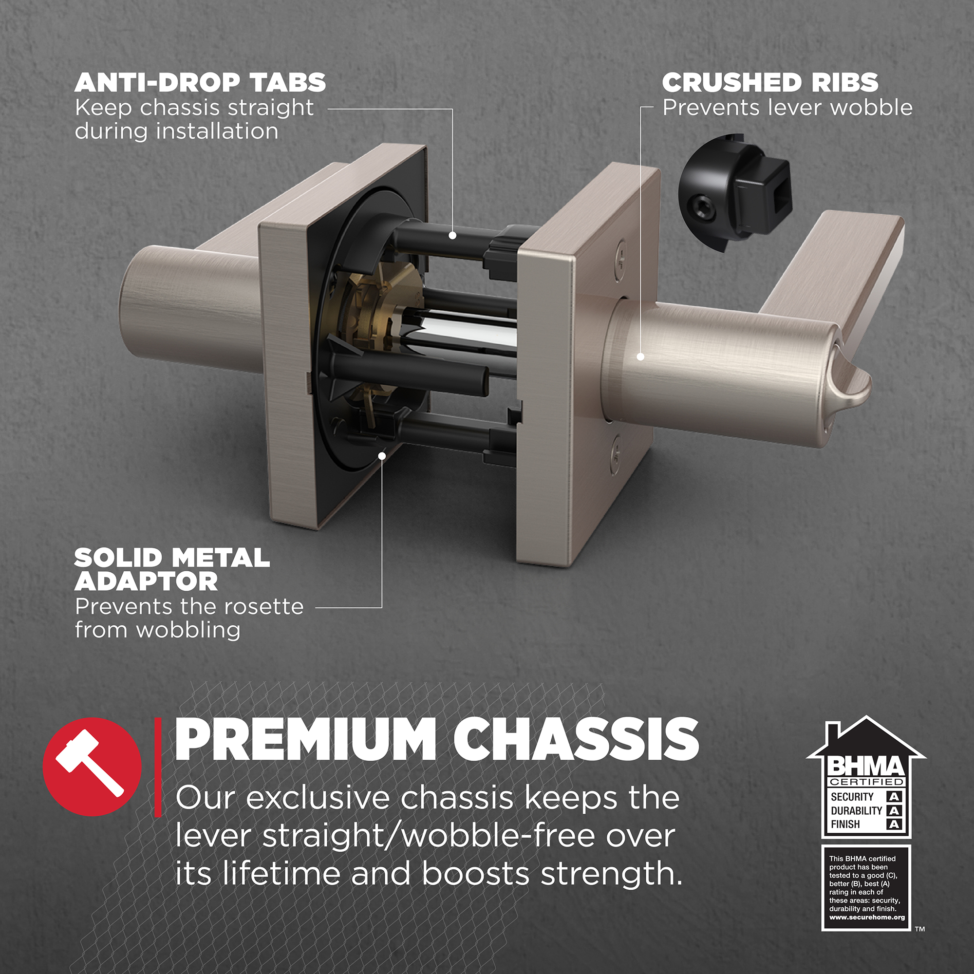 - Premium Chassis: Kwikset®’s exclusive chassis uses dual compression springs, keeping the lever straight and wobble-free over the lifetime of the product and enhancing its strength and rotational feel