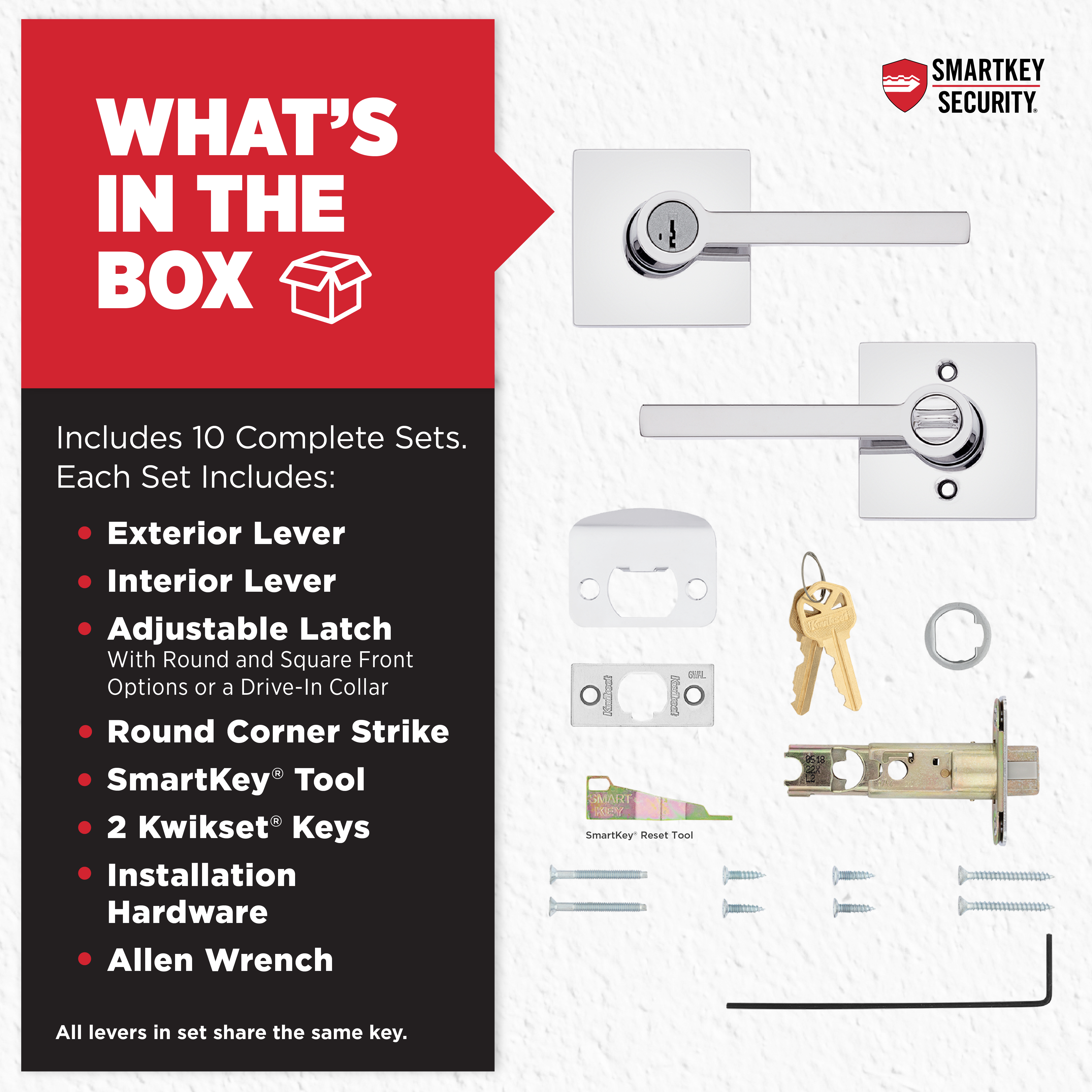BOX INCLUDES: 10 Entry levers, latch with round and square front options or drive-in collar, strike, SmartKey tool, 2 Kwikset keys, rosette, screws and Allen wrench