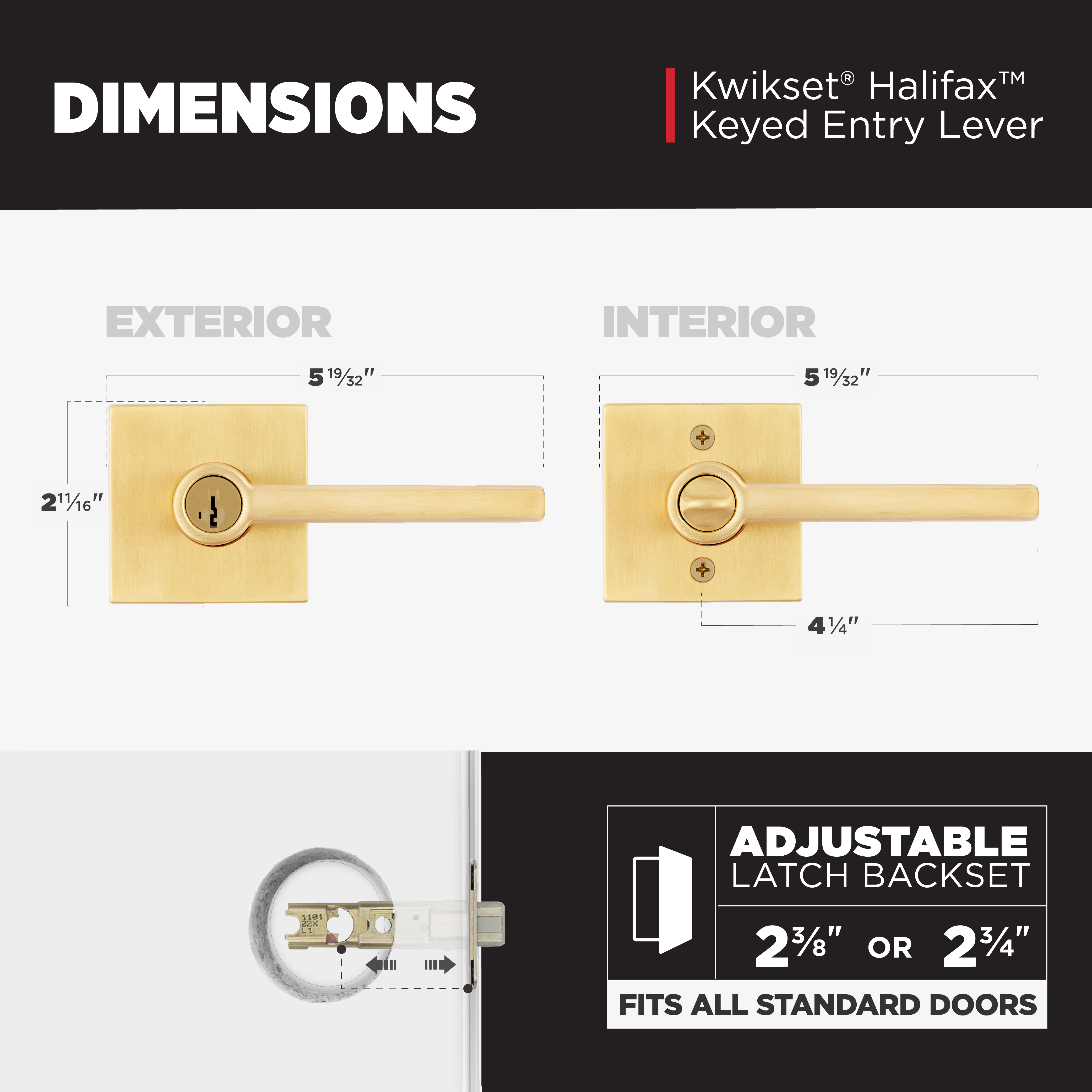 FITS STANDARD DOORS: Fits standard size doors 1-3/8" to 1-3/4" thick, latch backset adjusts to either 2-3/8" or 2-3/4" with just a twist during installation