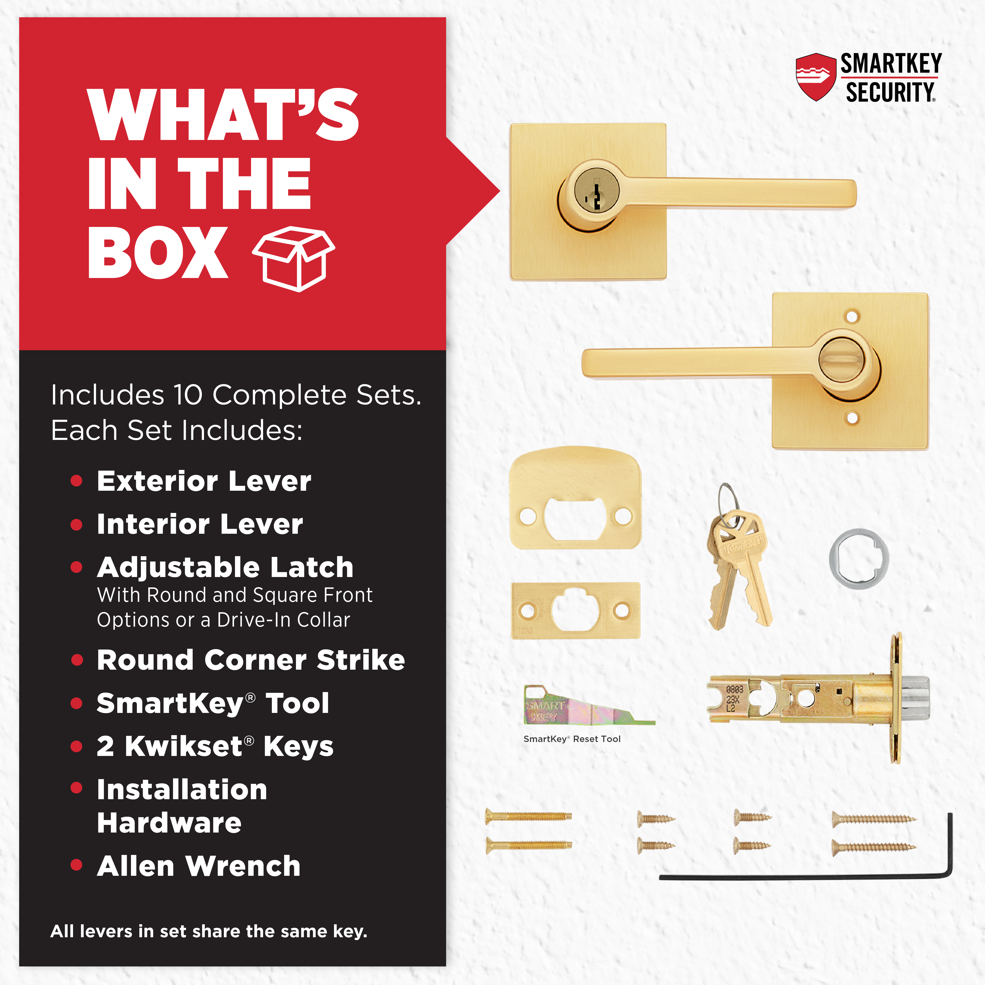 BOX INCLUDES: 10 Entry levers, latch with round and square front options or drive-in collar, strike, SmartKey tool, 2 Kwikset keys, rosette, screws and Allen wrench