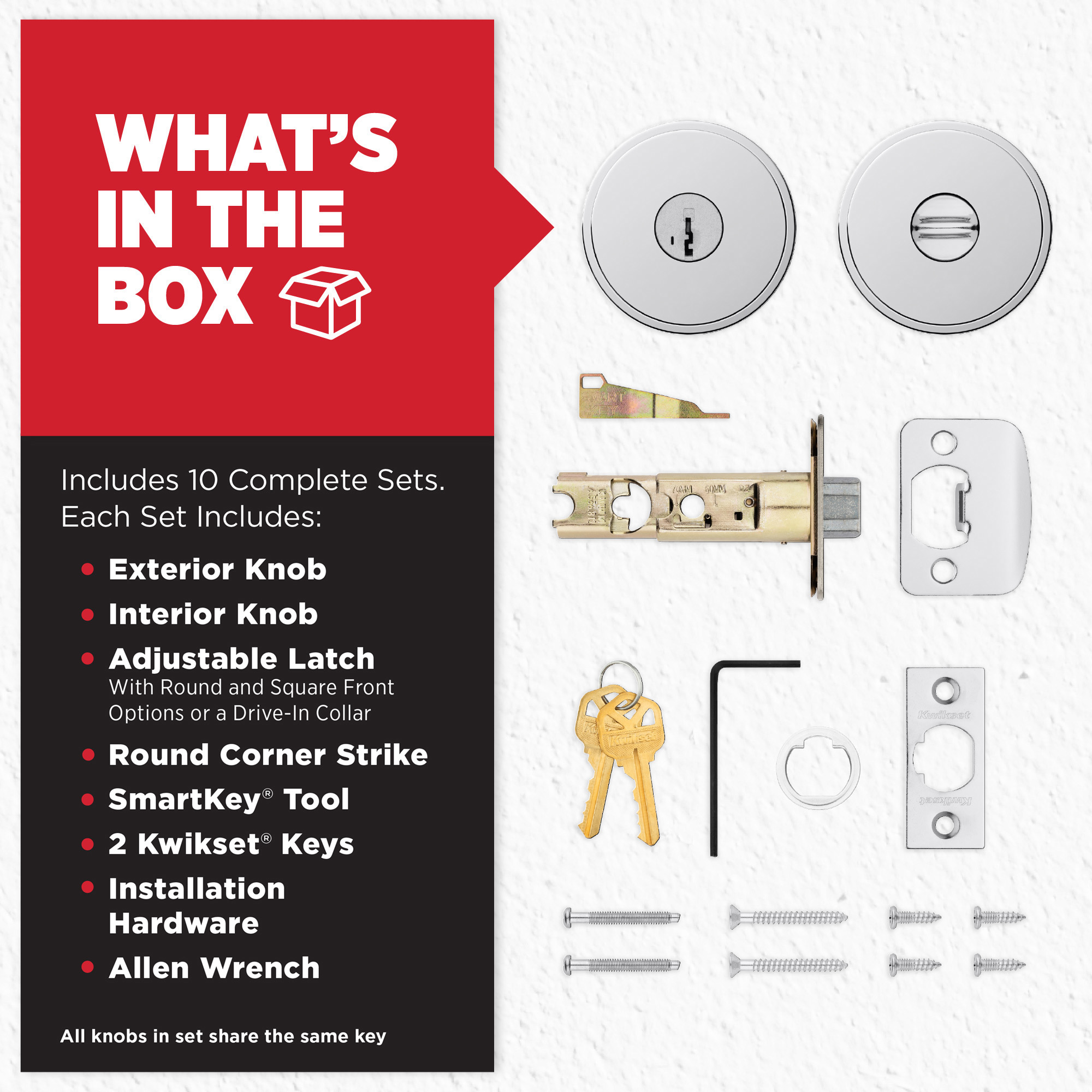 BOX INCLUDES: 10 Entry levers, latch with round and square front options or drive-in collar, strike, SmartKey tool, 2 Kwikset keys, rosette, screws and Allen wrench