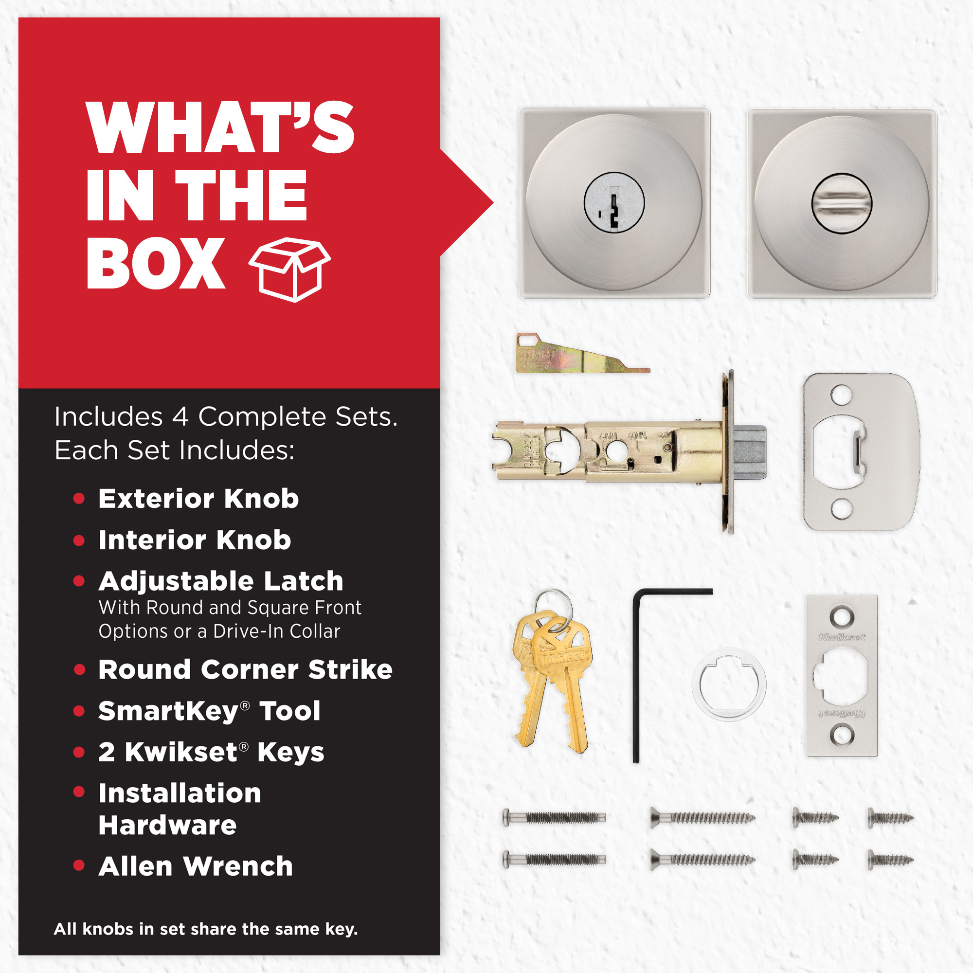 BOX INCLUDES: 4 Entry levers, latch with round and square front options or drive-in collar, strike, SmartKey tool, 2 Kwikset keys, rosette, screws and Allen wrench