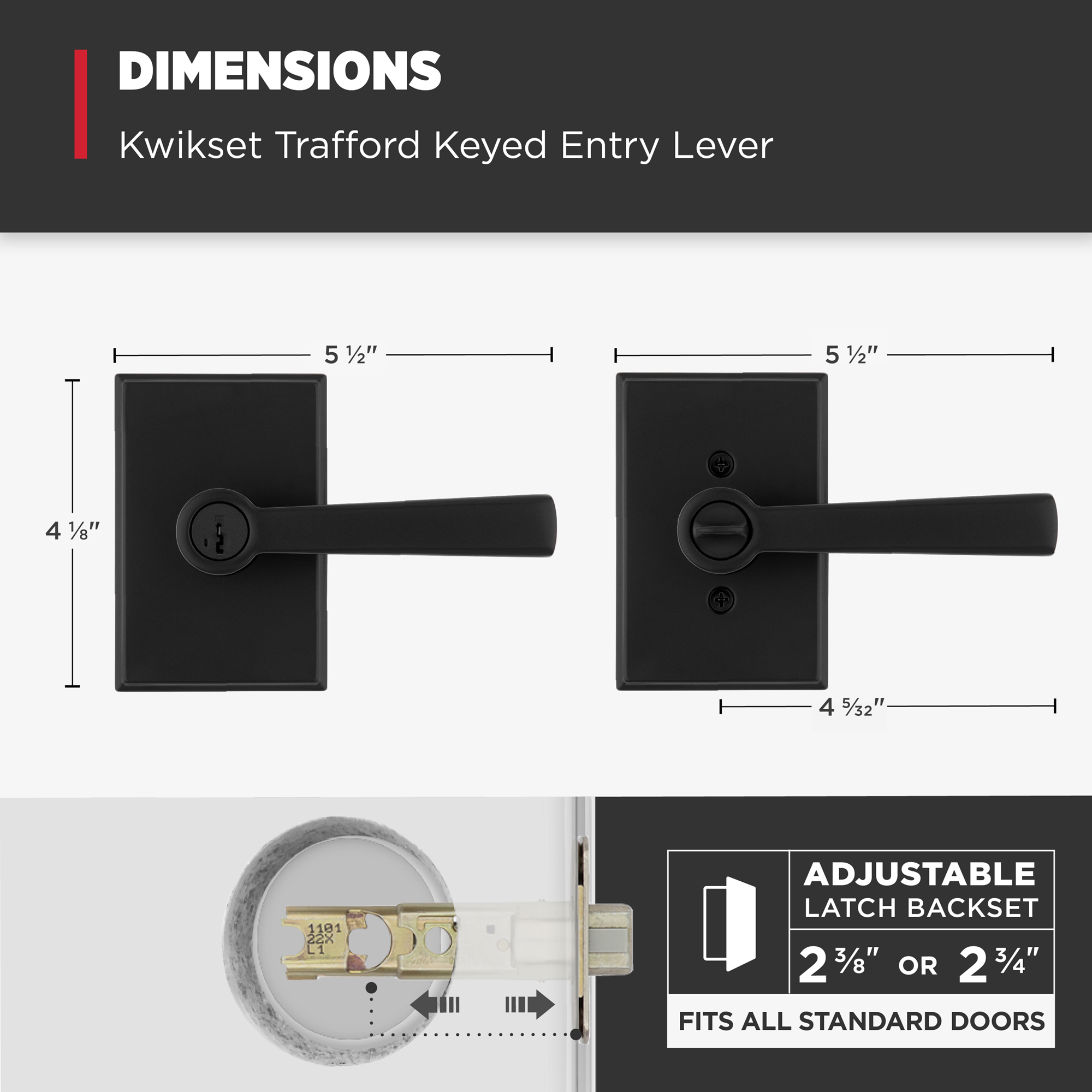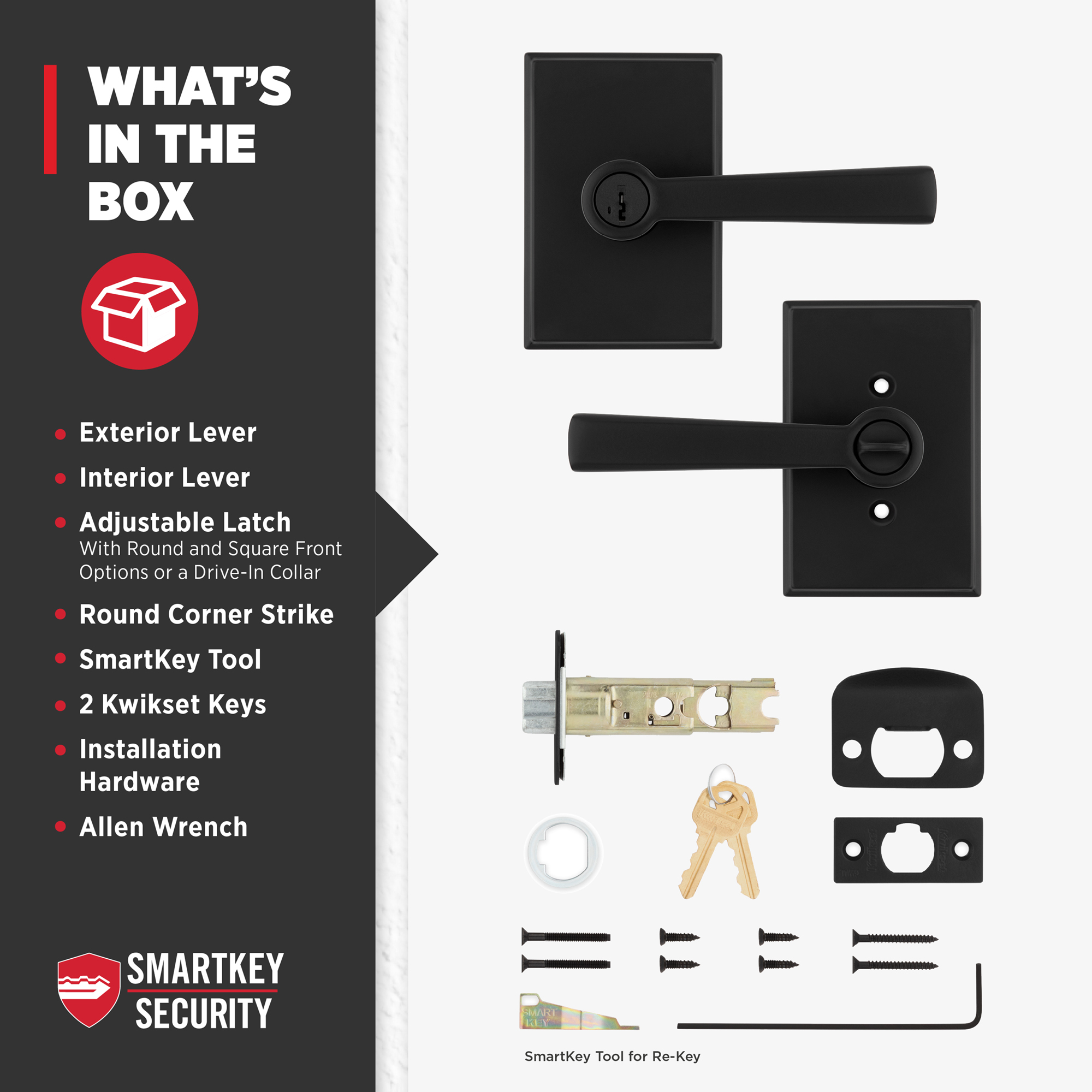 - Box Includes: Entry lever, adjustable latch with round and square front options or a drive-in collar, round corner strike, SmartKey tool, 2 Kwikset keys, installation hardware and Allen wrench