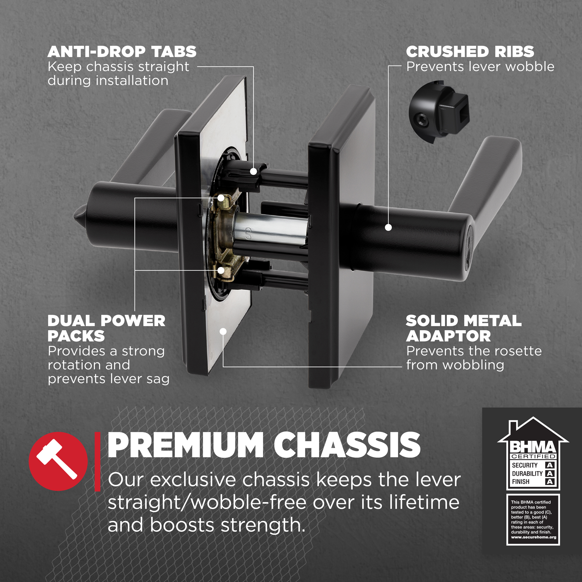 - Premium Chassis: Kwikset’s exclusive chassis uses dual compression springs, keeping the lever straight and wobble-free over the lifetime of the product and enhancing its strength and rotational feel