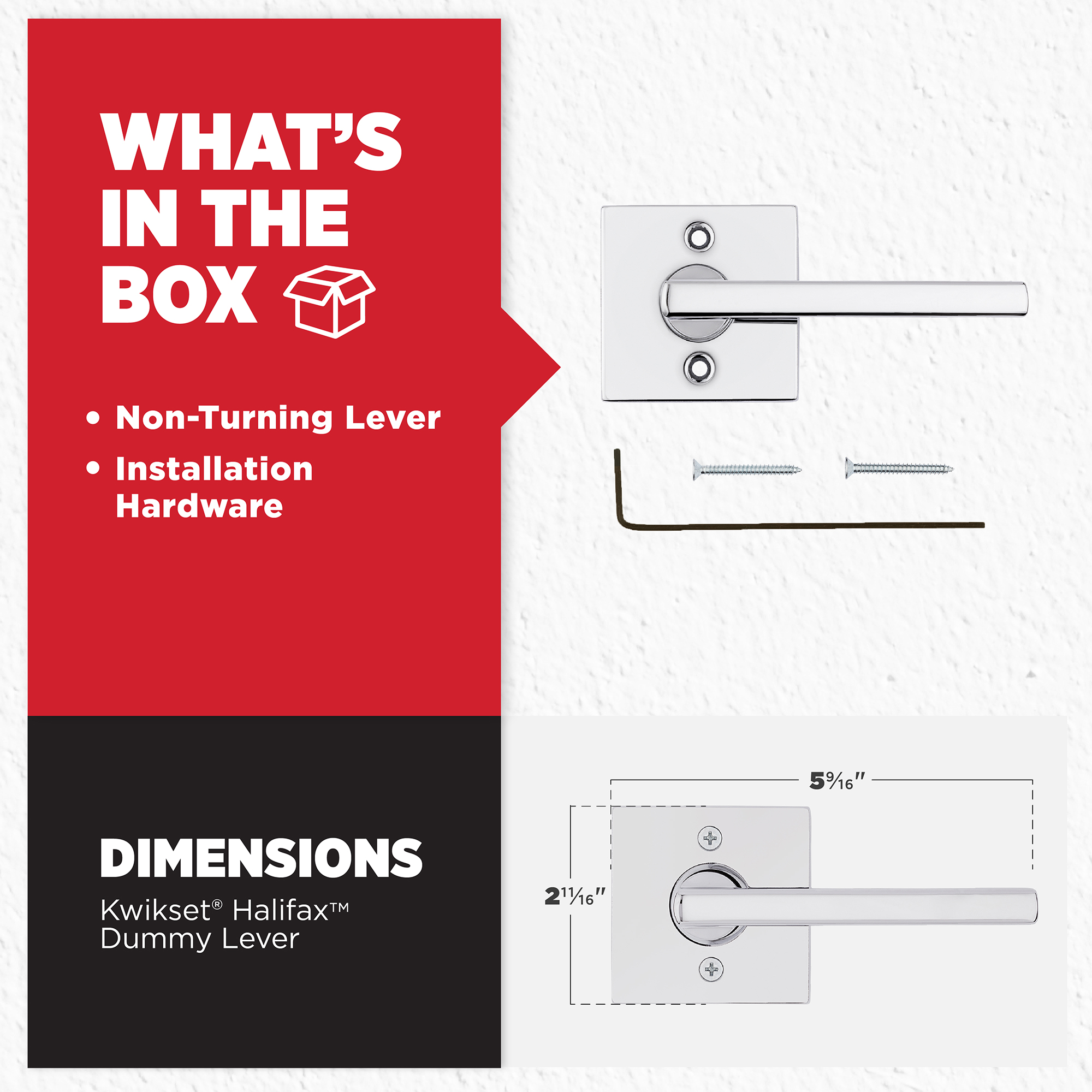 Box Includes Non-turning lever, installation hardware and Allen wrench