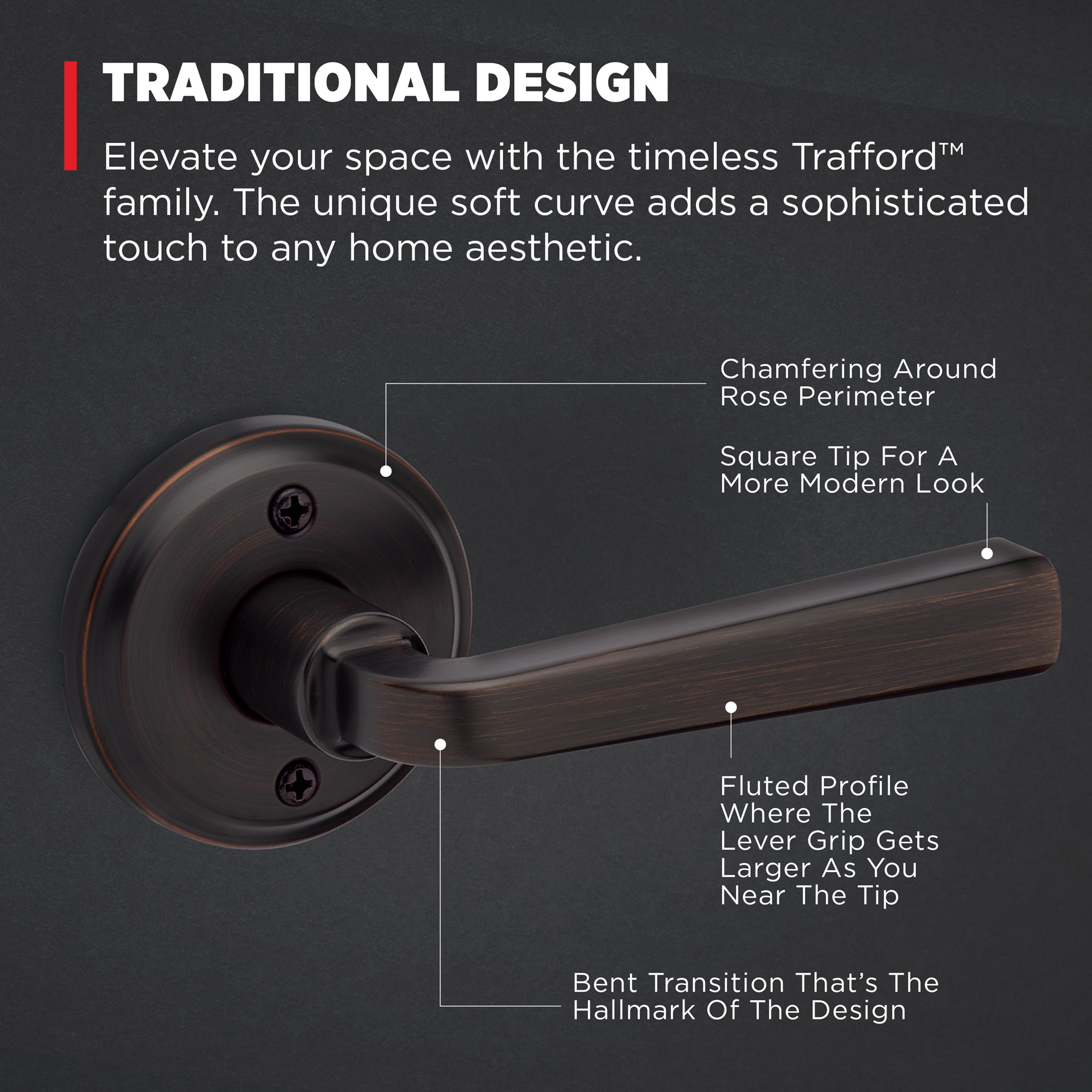 Step up to designer styles and superior security with Kwikset Signature Series products. Elevate your space with the timeless Trafford™ family. The unique soft curve adds a sophisticated touch to any home aesthetic, while the designer rosette imparts a warm and welcoming feel to your doors. Create your desired look with three premium finishes, then let our bump- and pick-resistant SmartKey® Security protect what matters most. Adorn your interior and exteriors with Trafford™ levers, and enjoy our highest level of security, easiest installation and peace of mind.