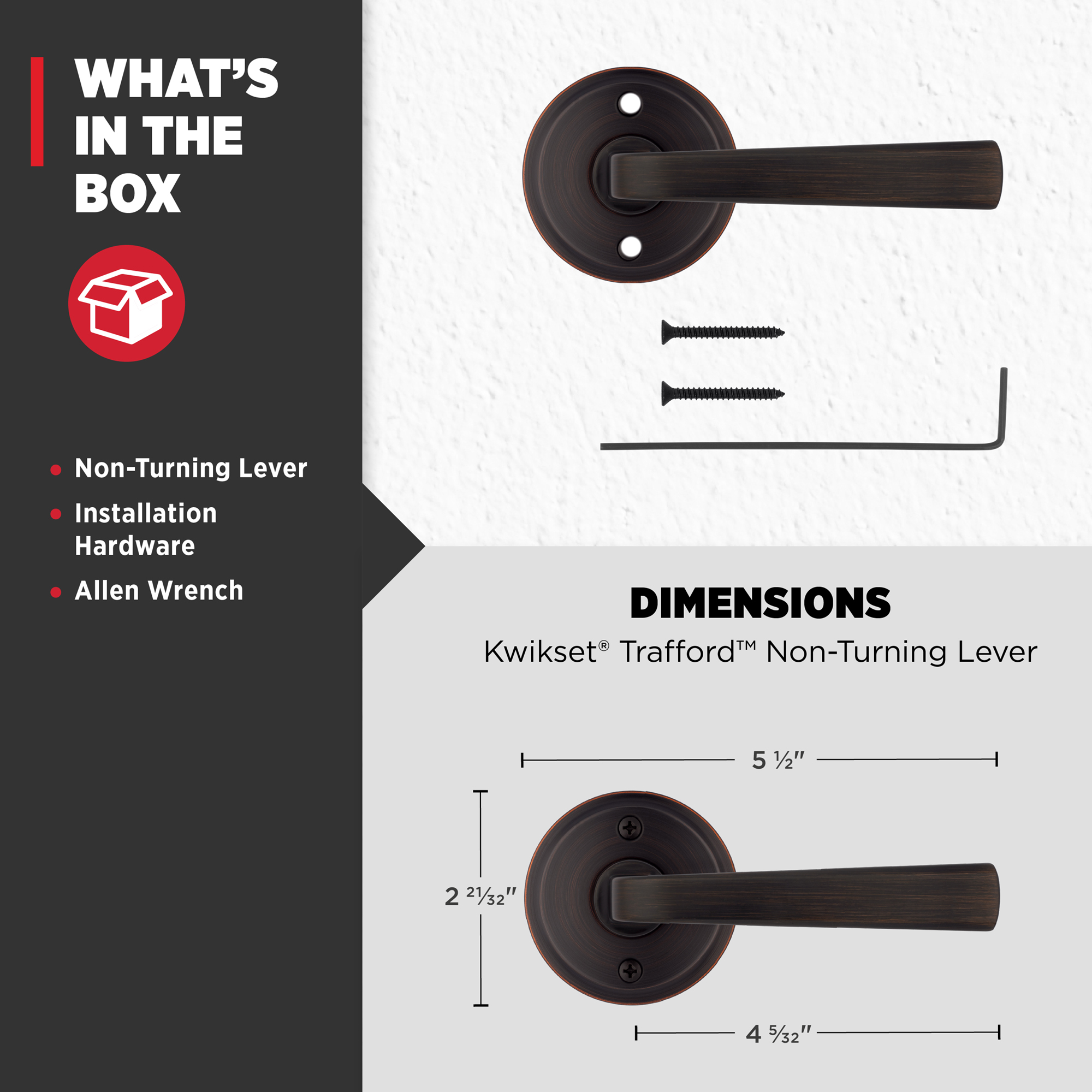 Box Includes: Non-turning lever, installation hardware and Allen wrench