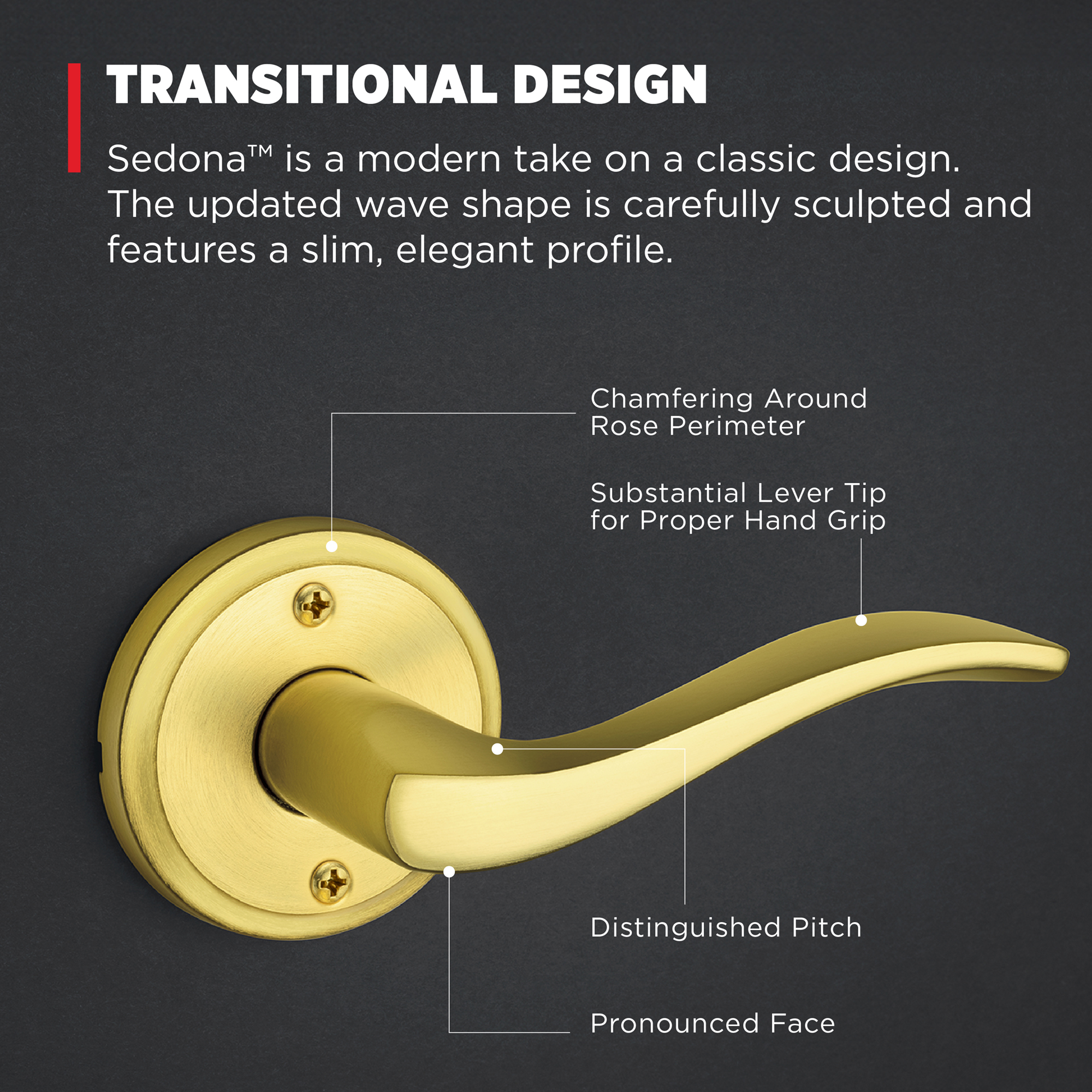 | Product Description | Step up to designer styles and superior security with Kwikset Signature Series products. Sedona™ is a modern take on a classic design. The updated wave shape is carefully sculpted and features a slim, elegant profile. Its round designer rosette will create a balanced look on your doors, while the collection offers a solution for both aesthetics and security. The exterior door lock comes with our patented SmartKey® Security, making it bump- and pick-resistant and re-keyable within seconds. Style your interior and exteriors with Sedona™, and enjoy our highest level of security, easiest installation experience and peace of mind. |
