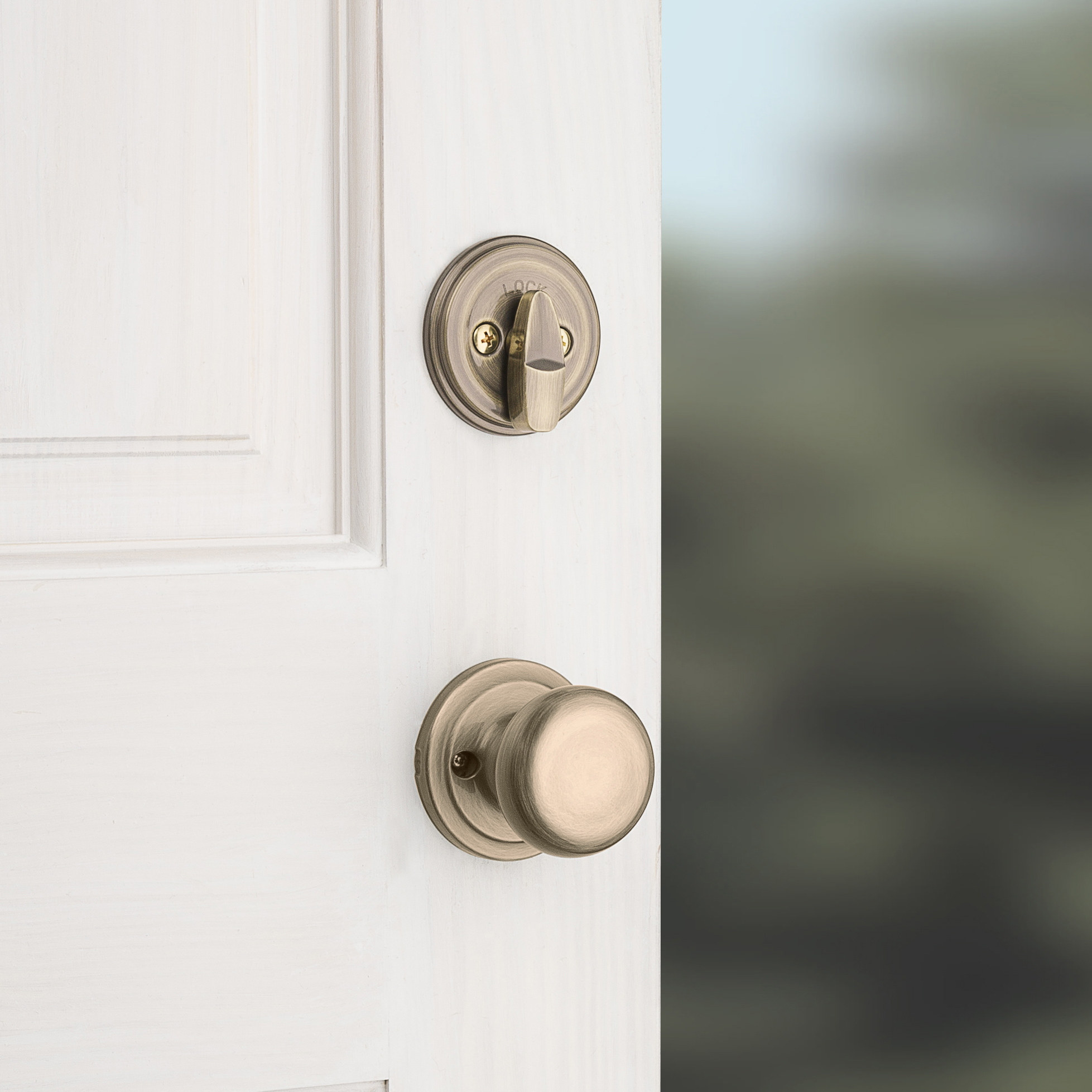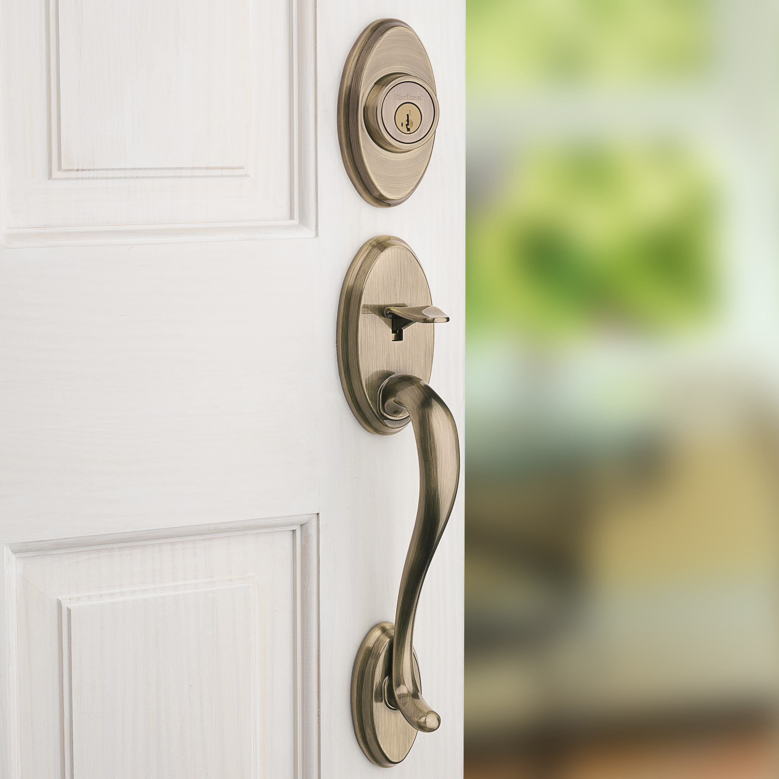Step up to designer styles and superior security with Kwikset Signature Series products. Shelburne's curvaceous styling expresses a sense of beauty and elegance. The latch bolt is operated by the thumb piece on the outside and the grip on the inside. The deadbolt is operated by a key on the outside and a thumb turn on the inside.