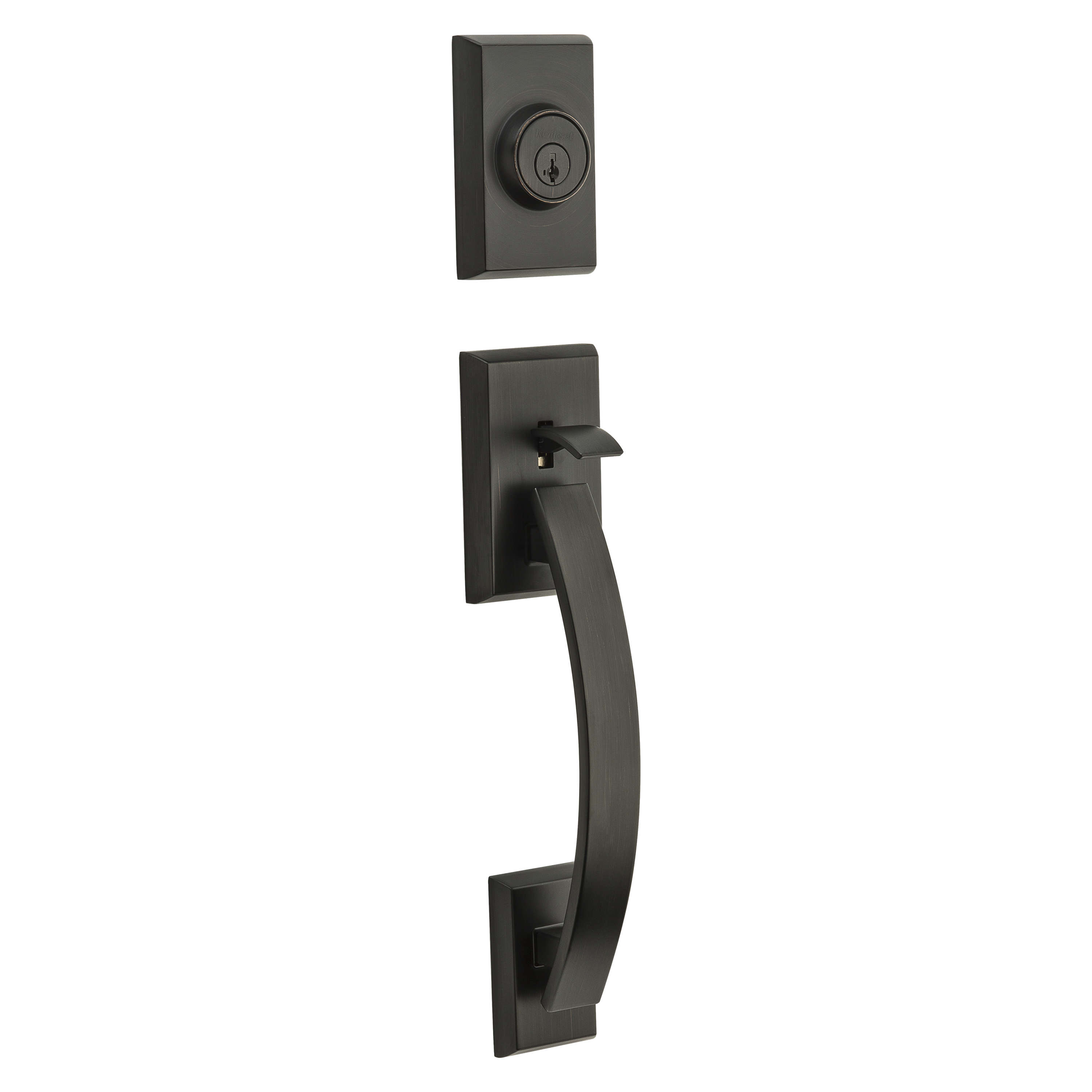 Step up to designer styles and superior security with Kwikset Signature Series products. Make a modern statement with the sleek and stylish Tavaris handleset. The latch bolt is operated by the thumb piece on the outside and the grip on the inside. The deadbolt is operated by a key on the outside and a thumb turn on the inside.