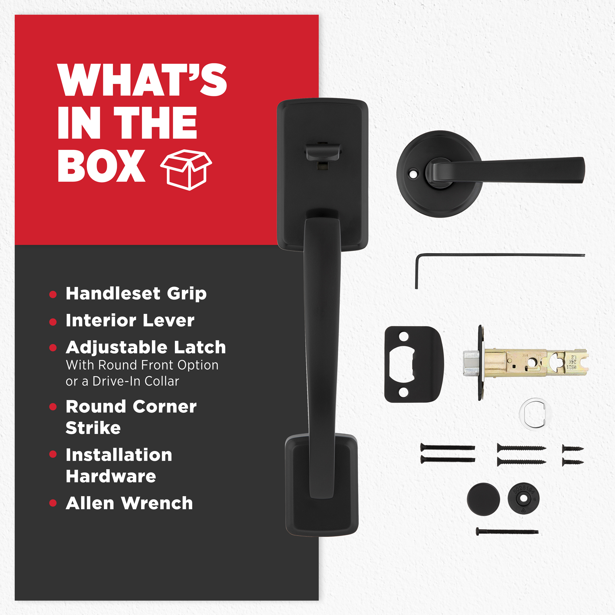 - Box Includes: Handleset, interior lever, Adjustable Latch with round front option or a drive-in collar, strike, installation hardware and Allen wrench