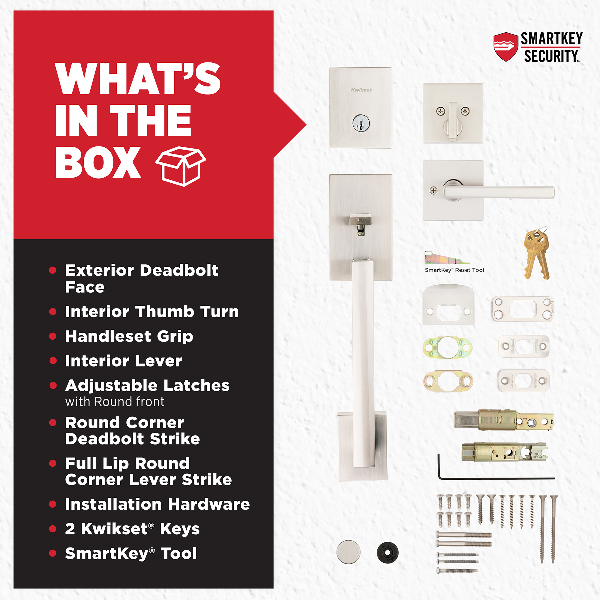 Box Includes: Box Includes entry levers, Adjustable Latch with round and square front options or drive-in collar, round corner strike, Smartkey tool, 2 Kwikset keys, designer rosette, screws and Allen wrench