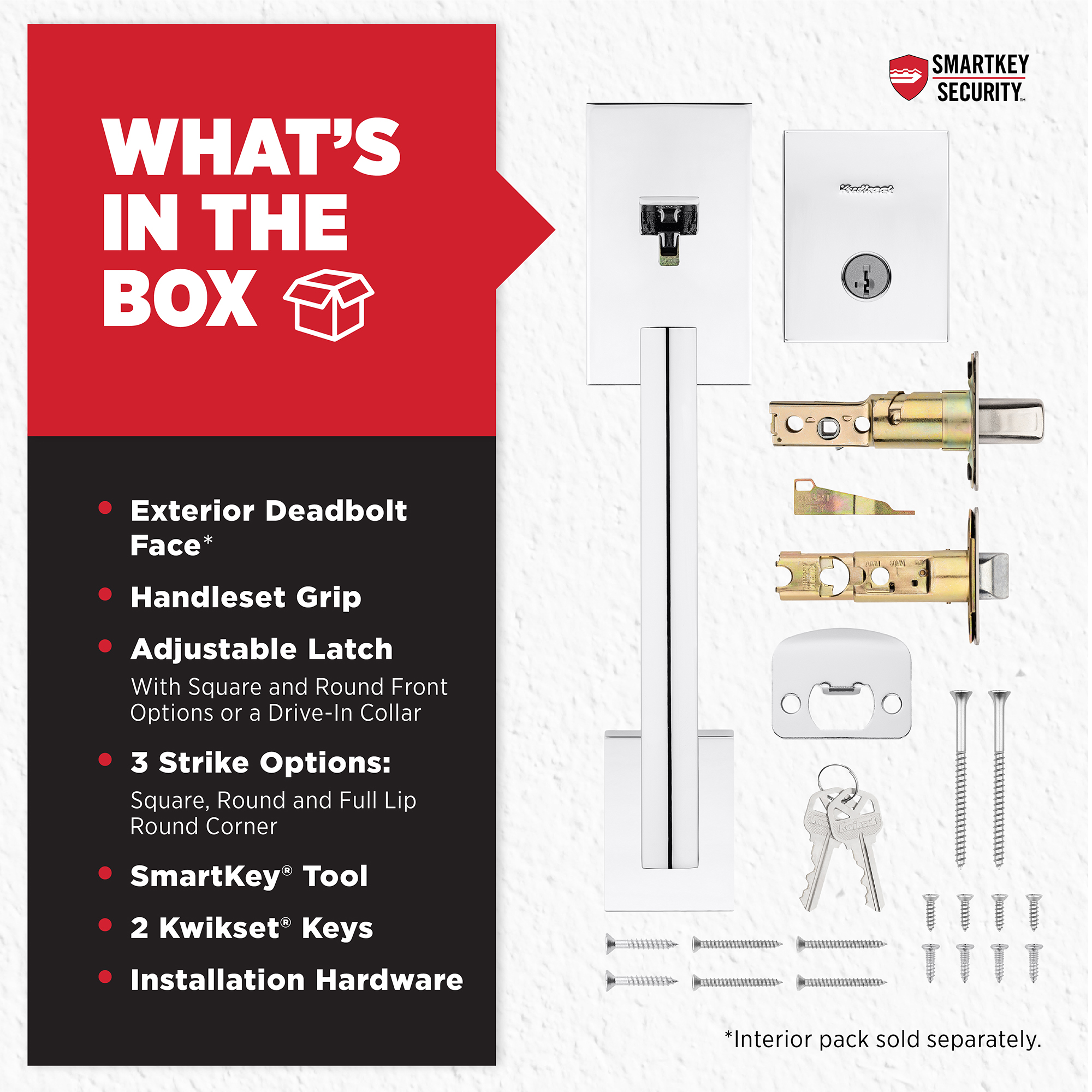 - Handlset Exterior Only: Use on exterior front doors, combine with a Kwikset 971 interior handle and turn piece to match your style indoors (sold separately)