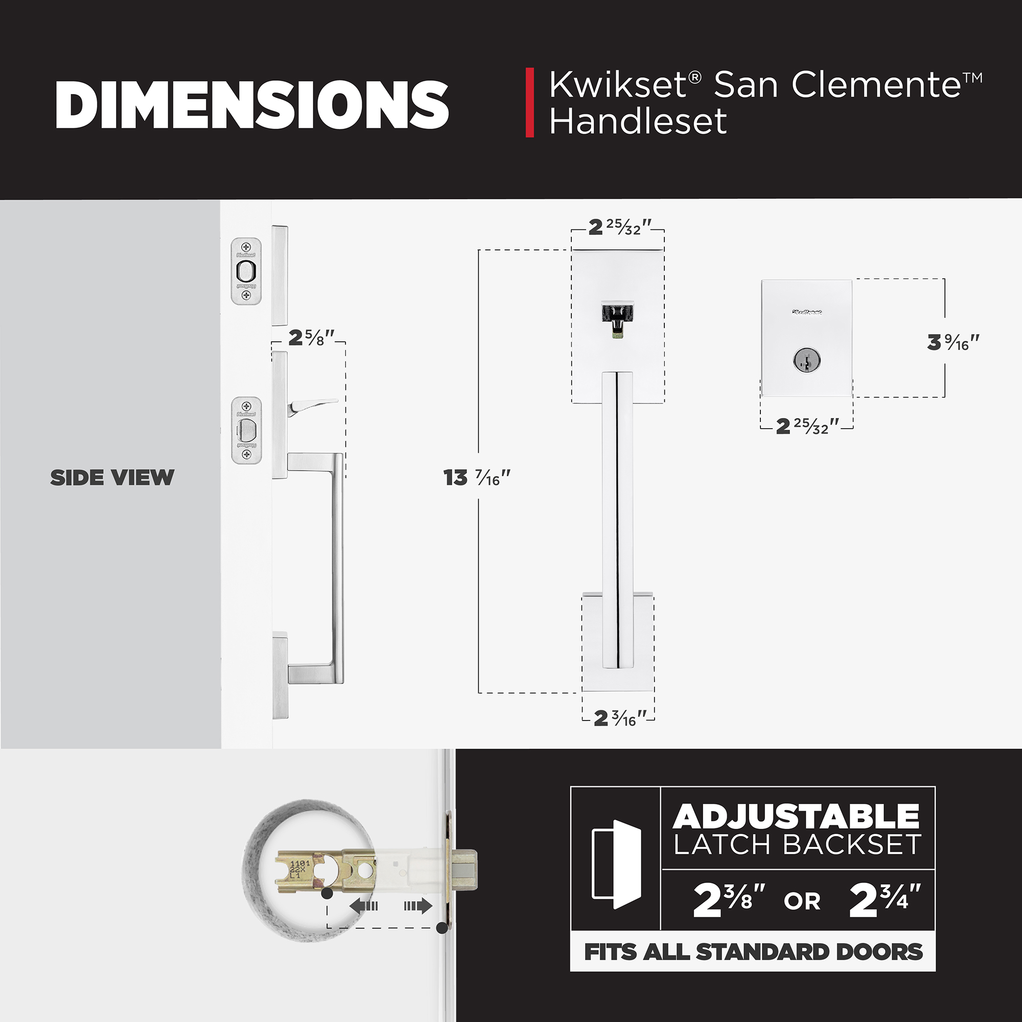 - Fits Standard Doors: Fits standard size doors 1-3/4" thick, latch backset adjusts to either 2-3/8" or 2-3/4" by sliding the adjustment pin during installation
