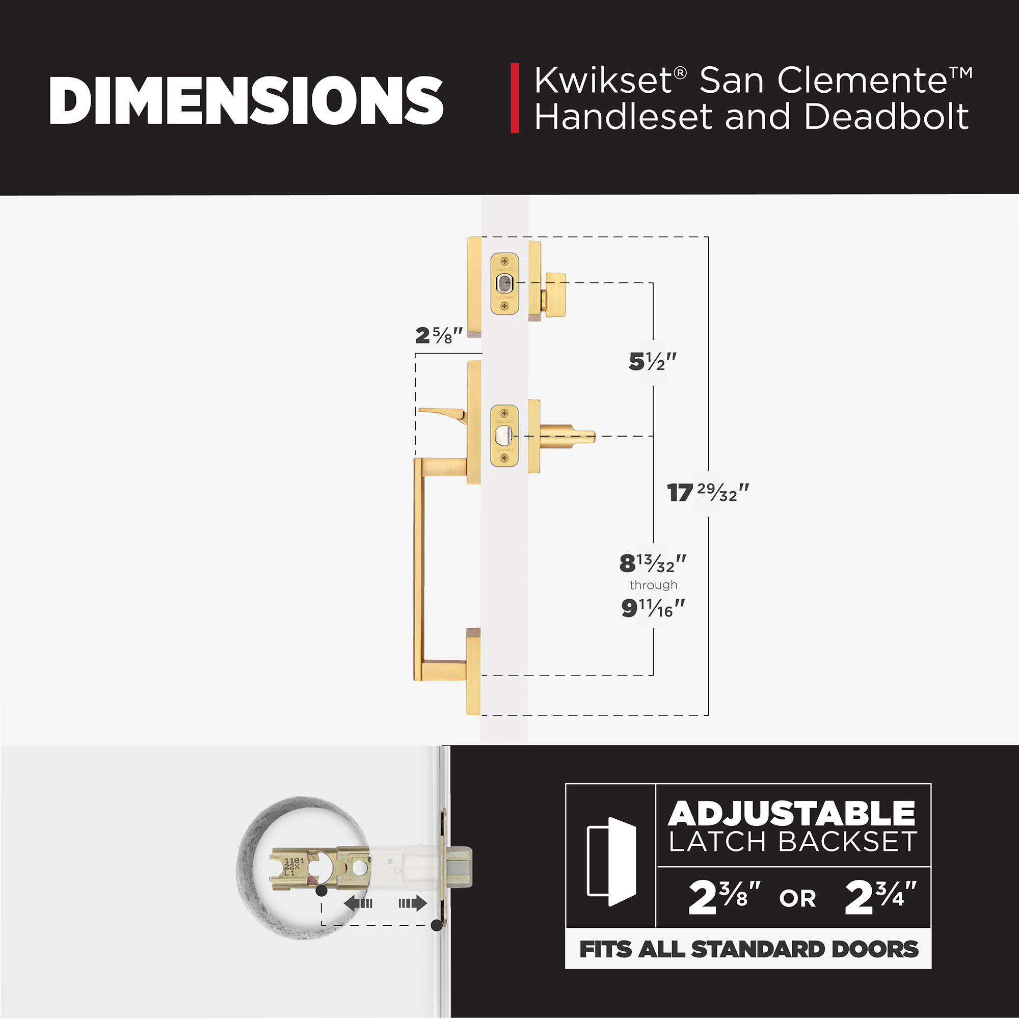 Latch has adjustable backset 2-3/8" to 2-3/4" to fit all standard door preparations