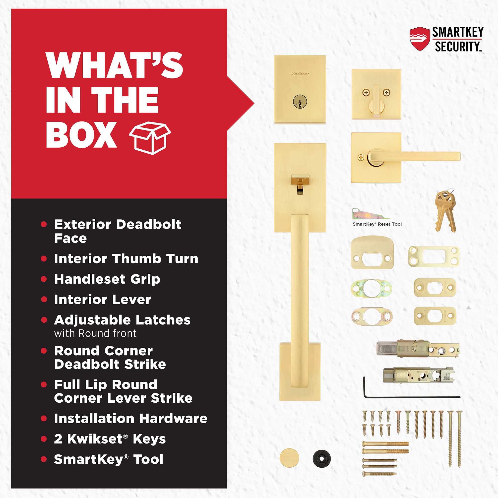SmartKey Security™ re-key technology is compatible with Kwikset (KW1) keyway or (SC1) keyway options