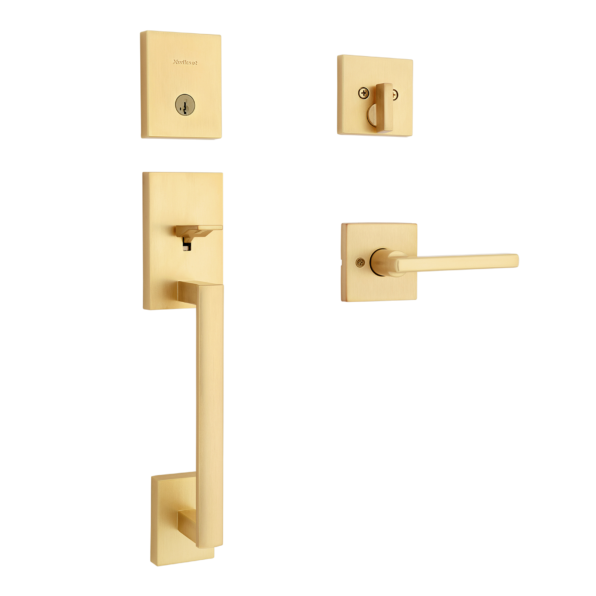 Handleset with Deadbolt: Use on exterior front doors with two bore holes, comes with interior lever and locking deadbolt turn piece, key operated from outside
