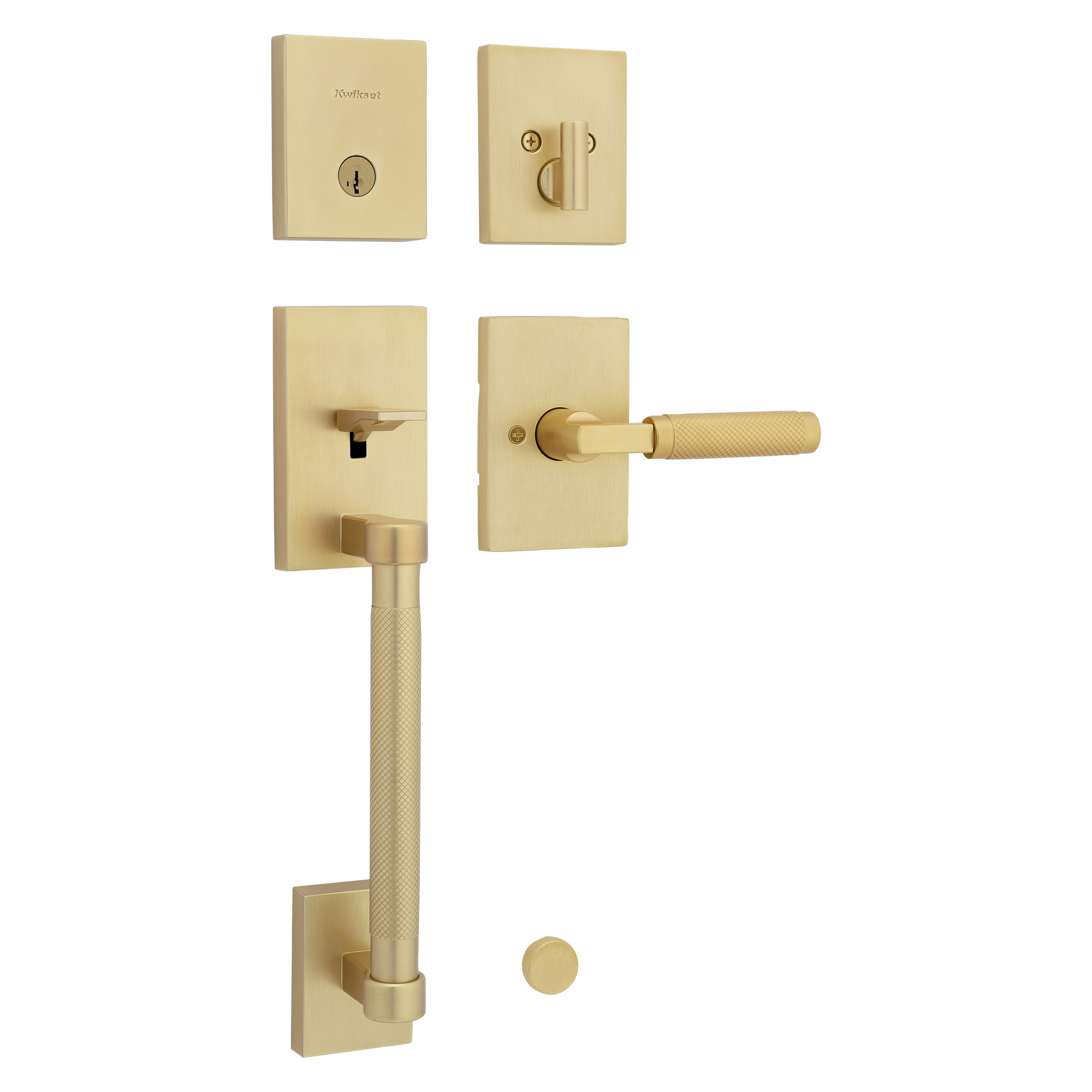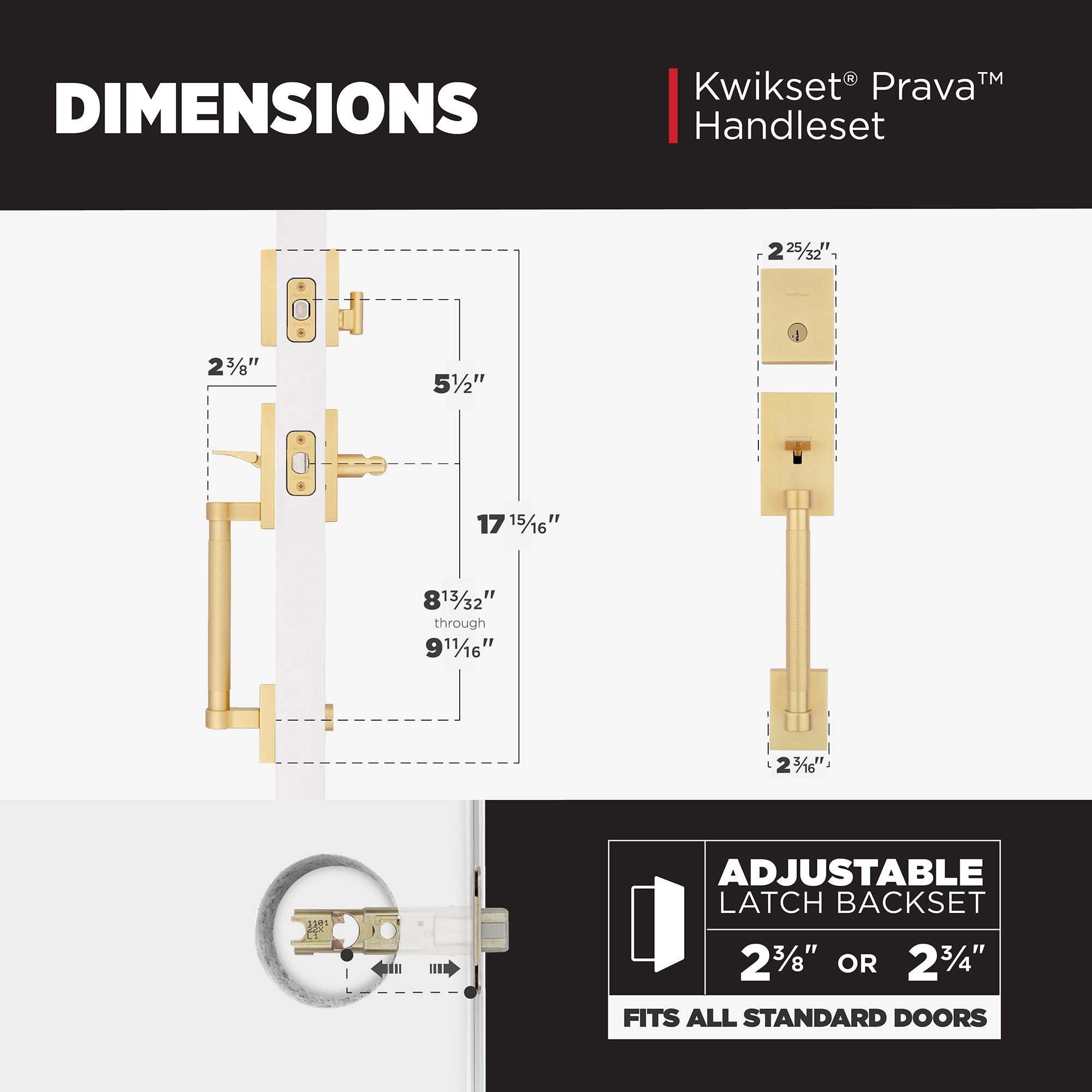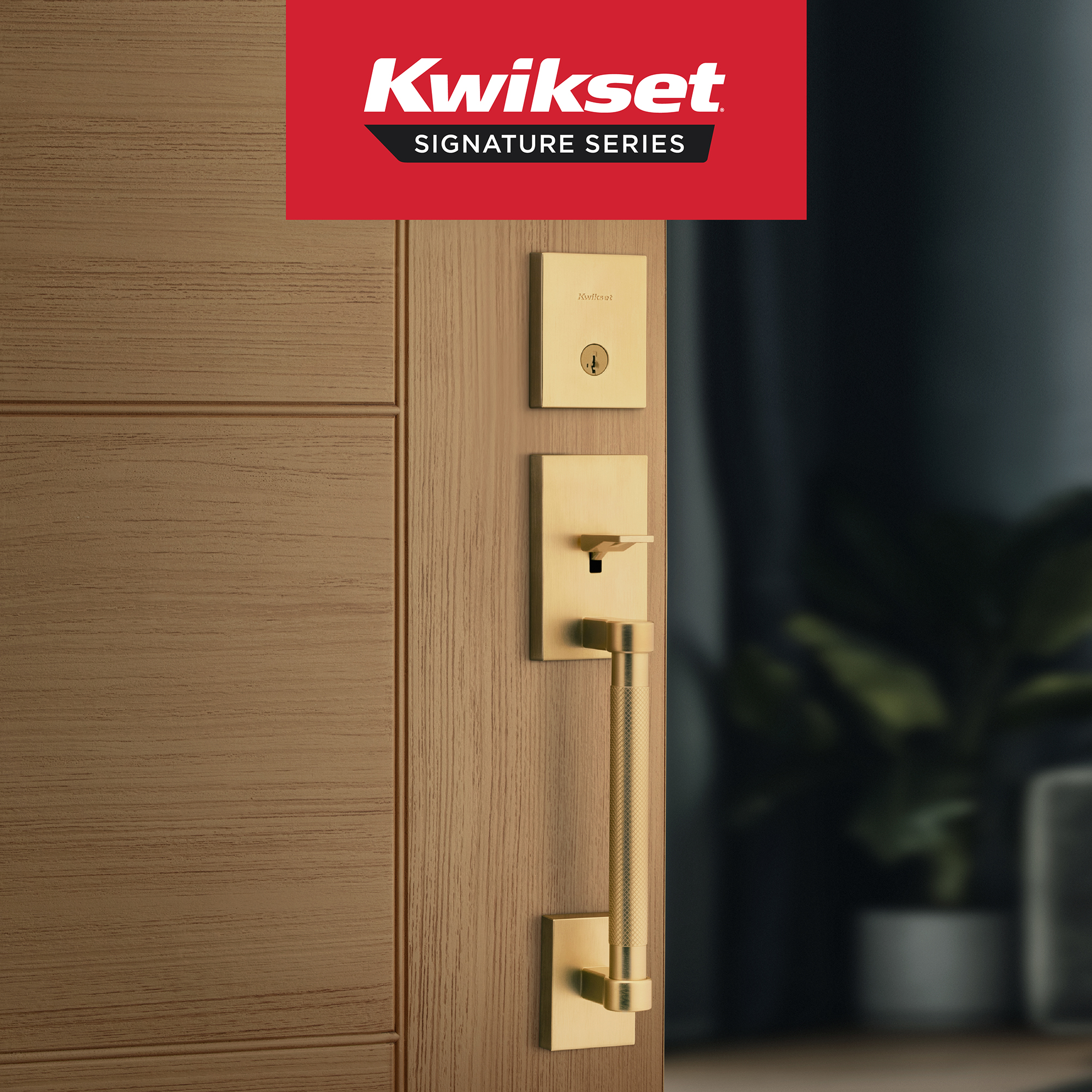 Step up to designer styles and superior security with Kwikset Signature Series products. Prava merges alluring aesthetics and trusted functionality. With intricate, decorative knurling, you can feel the Kwikset difference on each statement piece. Experience tactile luxury, contemporary style and elevated craftsmanship on every door. The latch bolt is operated by the thumb piece on the outside and the grip on the inside. The deadbolt is operated by a key on the outside and a thumb turn on the inside. The textured finish of Satin Brass gives it a refined, rustic look.
