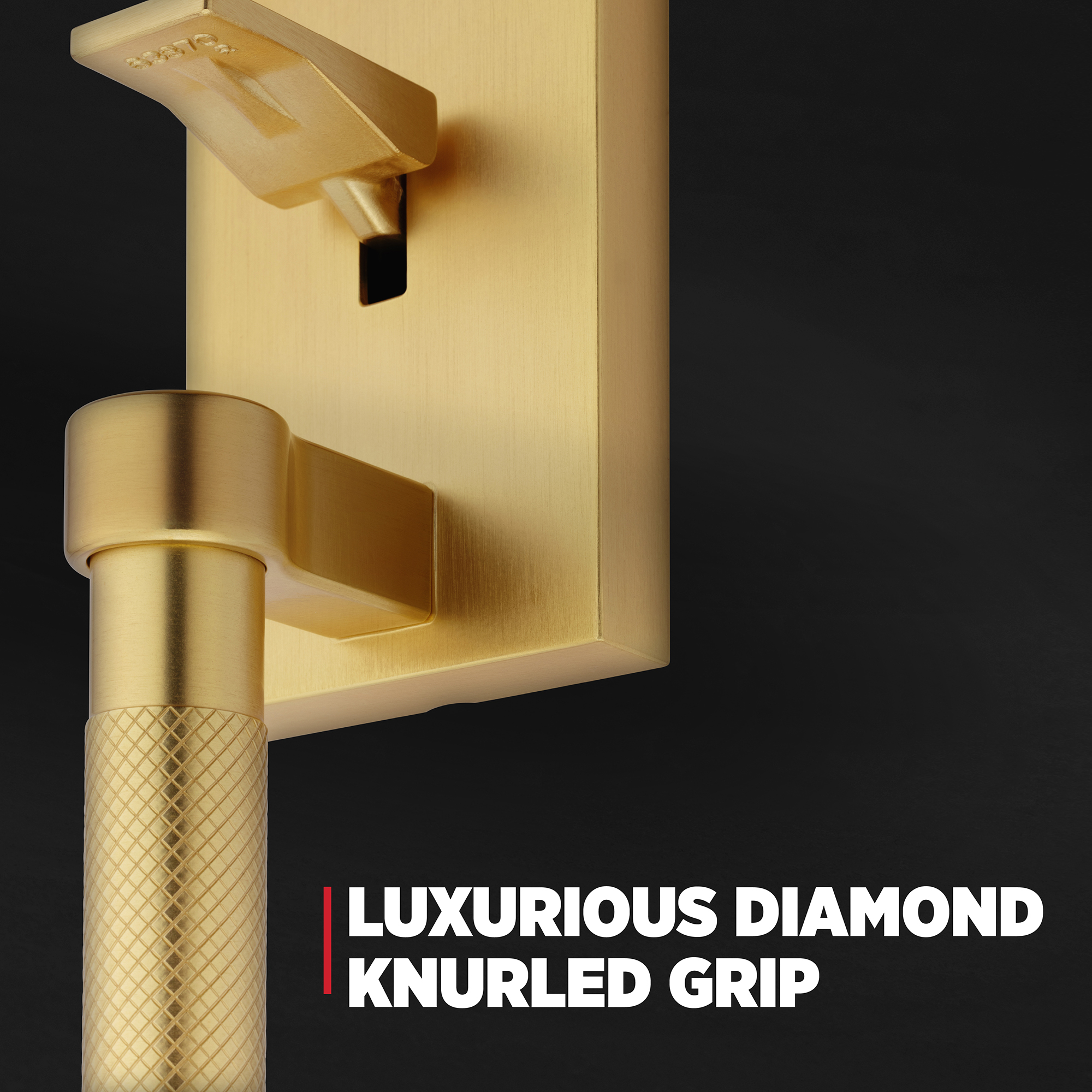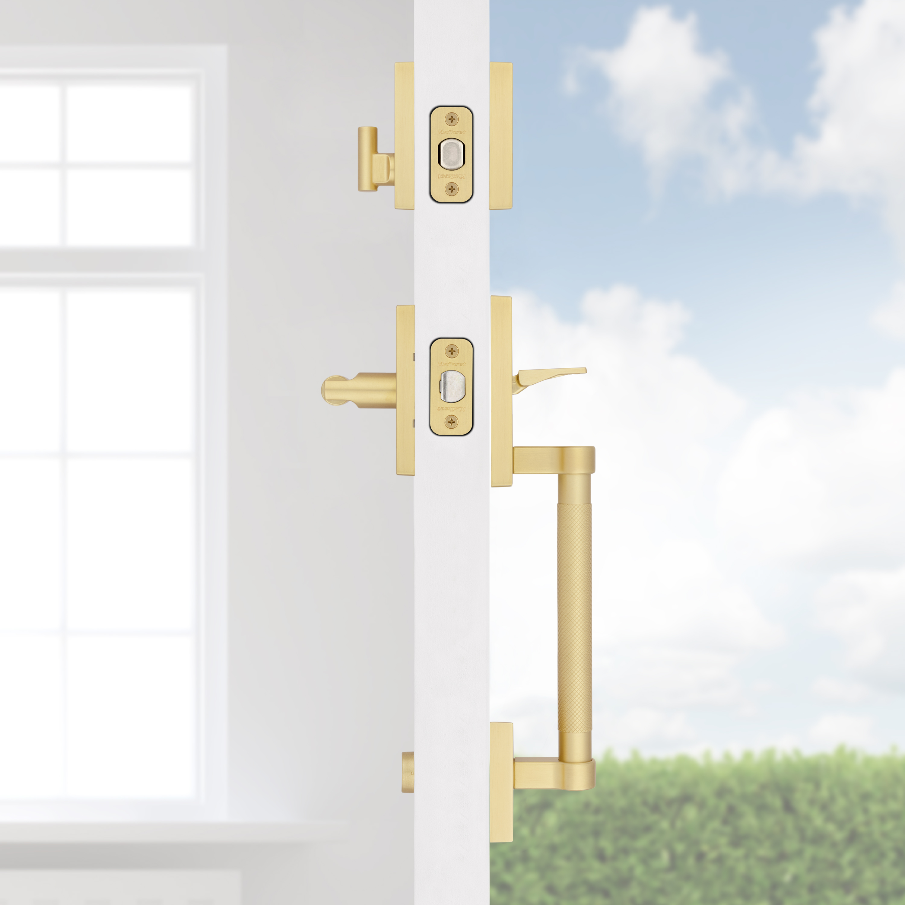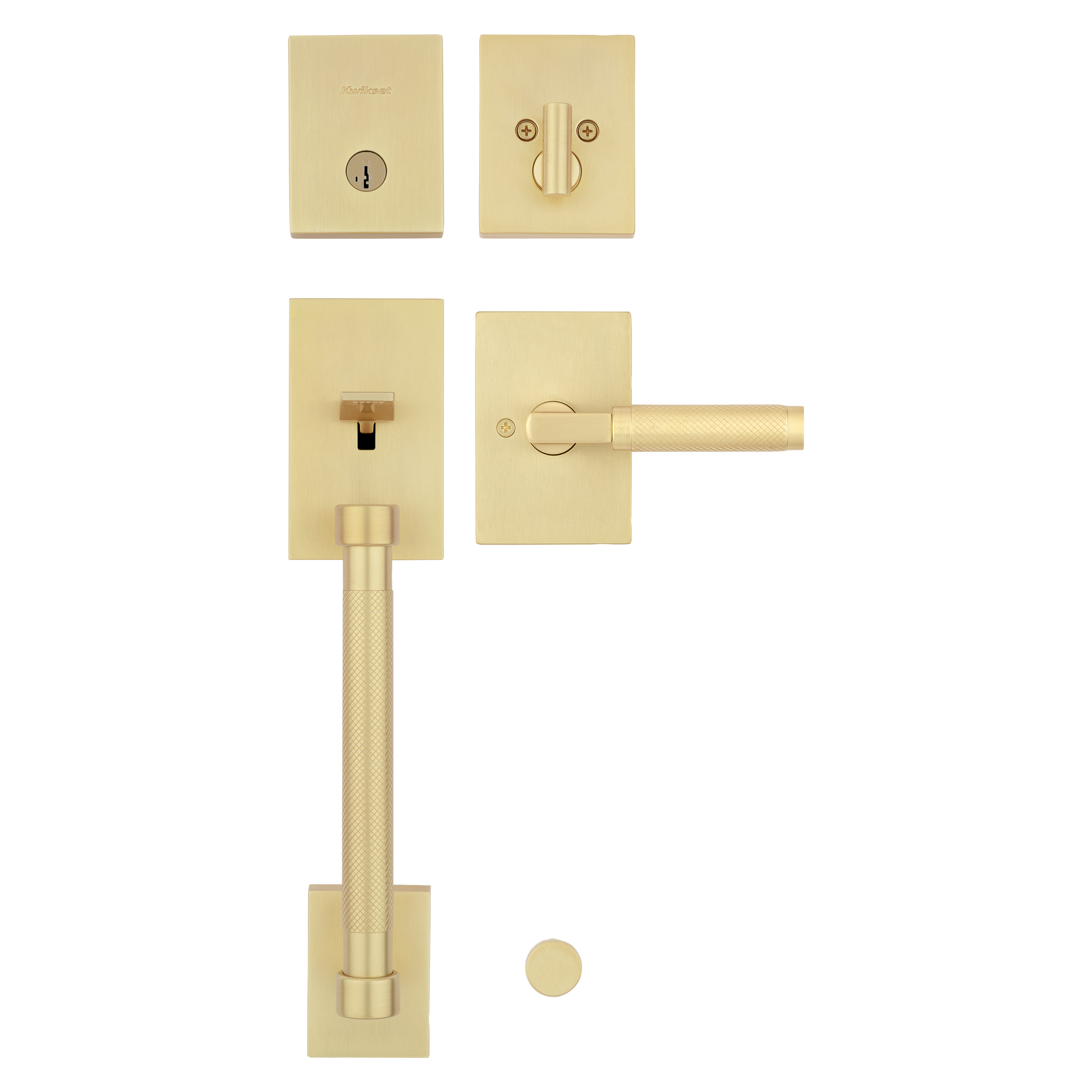 Step up to designer styles and superior security with Kwikset Signature Series products. Prava merges alluring aesthetics and trusted functionality. With intricate, decorative knurling, you can feel the Kwikset difference on each statement piece. Experience tactile luxury, contemporary style and elevated craftsmanship on every door. The latch bolt is operated by the thumb piece on the outside and the grip on the inside. The deadbolt is operated by a key on the outside and a thumb turn on the inside. The textured finish of Satin Brass gives it a refined, rustic look.