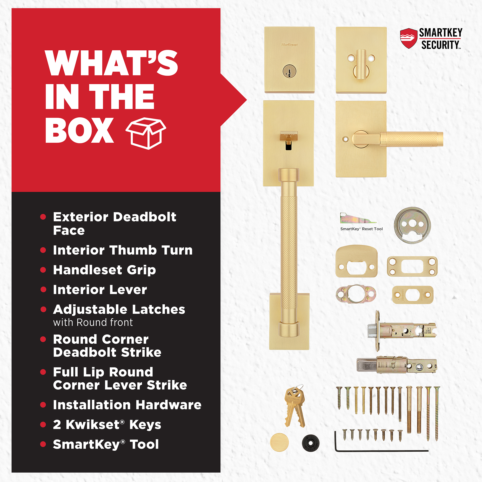 Box Includes: Box Includes deadbolt, lever, Adjustable Latches with round and square front options or drive-in collar, round corner strikes, SmartKey tool, 2 Kwikset keys, screws and Allen wrench