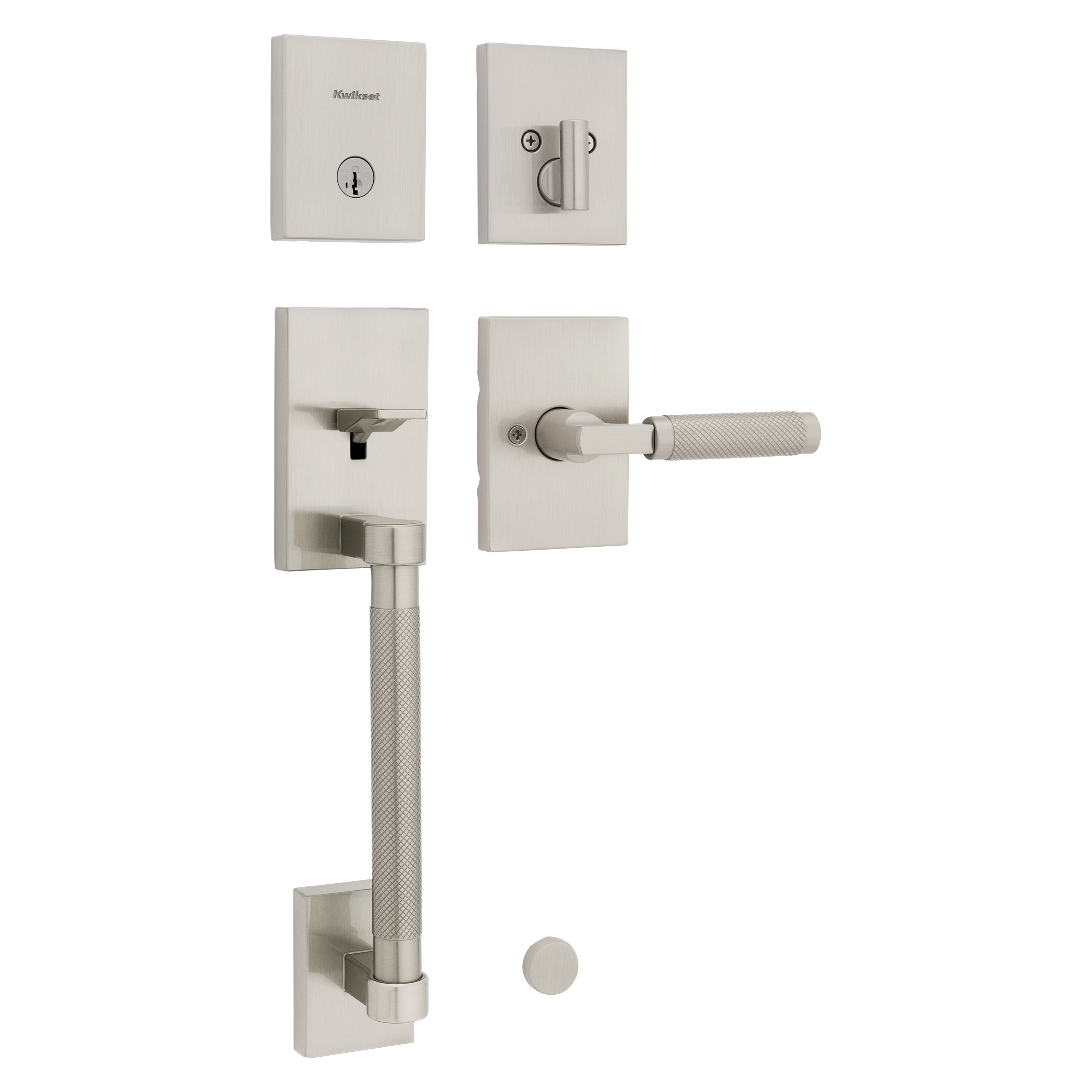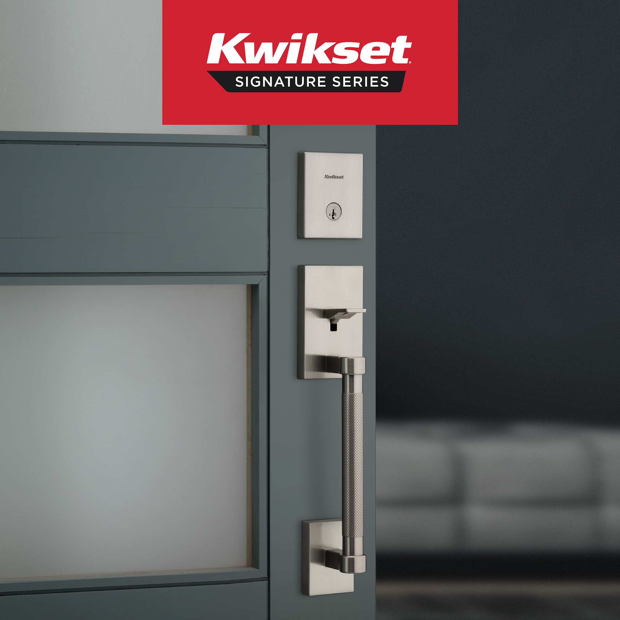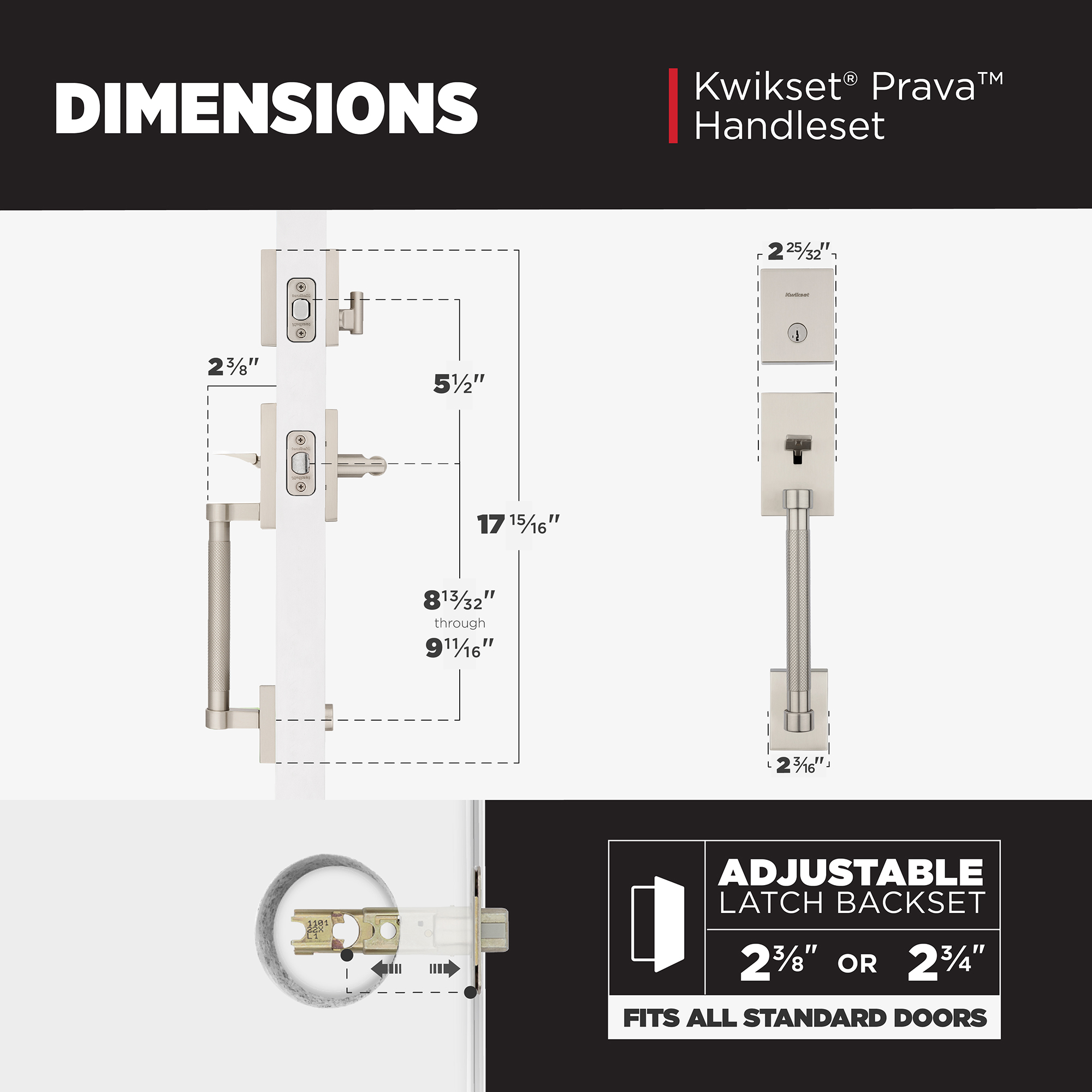 Step up to designer styles and superior security with Kwikset Signature Series products. Prava merges alluring aesthetics and trusted functionality. With intricate, decorative knurling, you can feel the Kwikset difference on each statement piece. Experience tactile luxury, contemporary style and elevated craftsmanship on every door. The latch bolt is operated by the thumb piece on the outside and the grip on the inside. The deadbolt is operated by a key on the outside and a thumb turn on the inside. The crisp, clean appearance of the Satin Nickel finish adds to the overall look of the product and brings a modern feel.