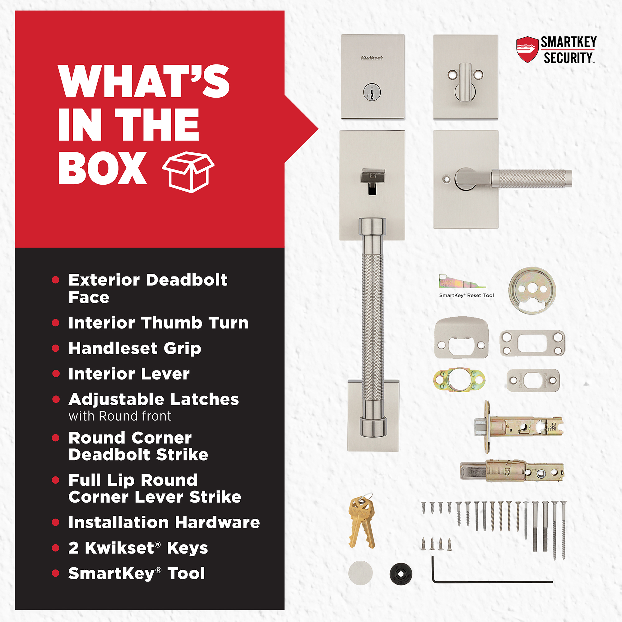 Box Includes: Box Includes deadbolt, lever, Adjustable Latches with round and square front options or drive-in collar, round corner strikes, SmartKey tool, 2 Kwikset keys, screws and Allen wrench