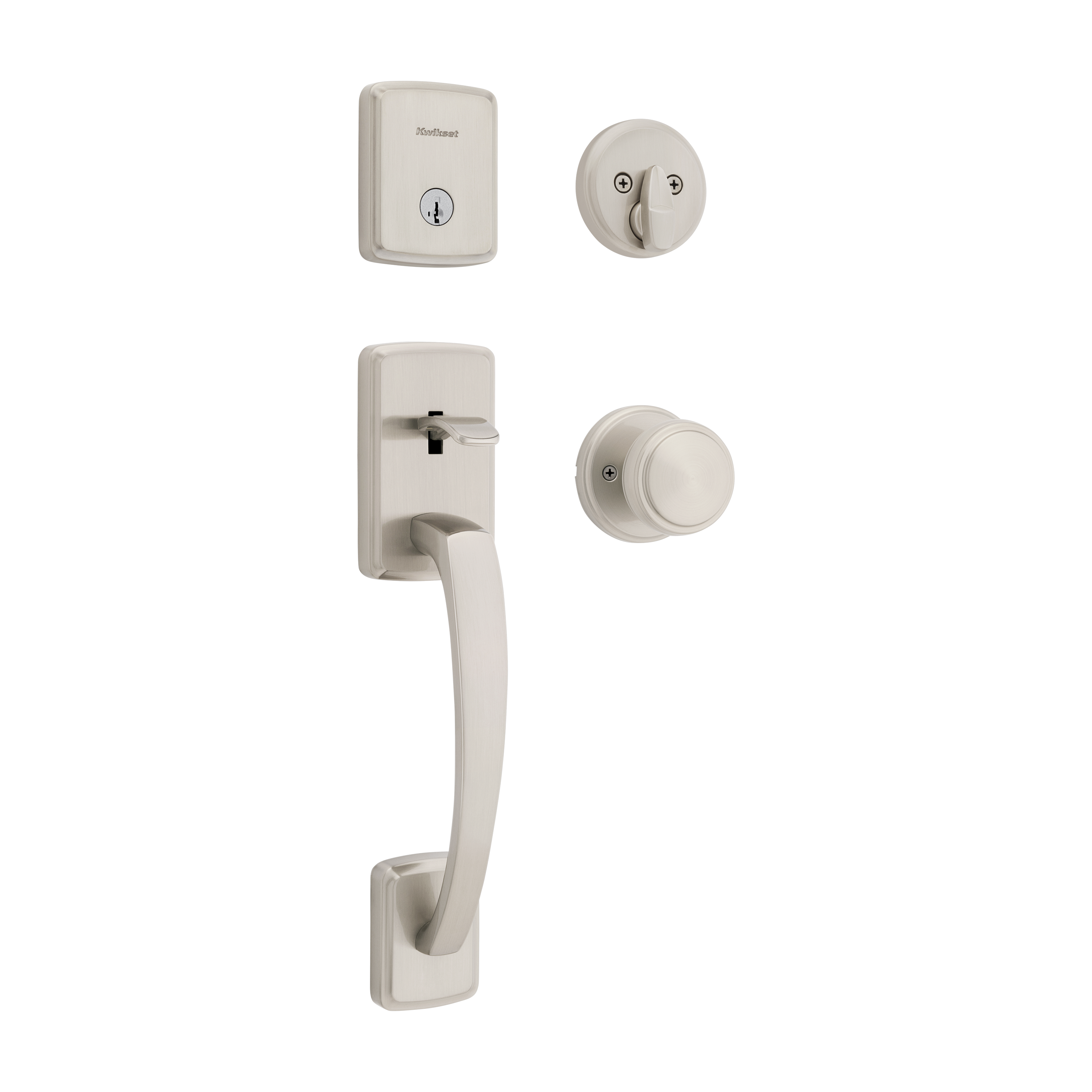Handlset with Deadbolt: Use on exterior front doors with two bore holes, comes withinterior knob and locking deadbolt turn piece, key operated from outside