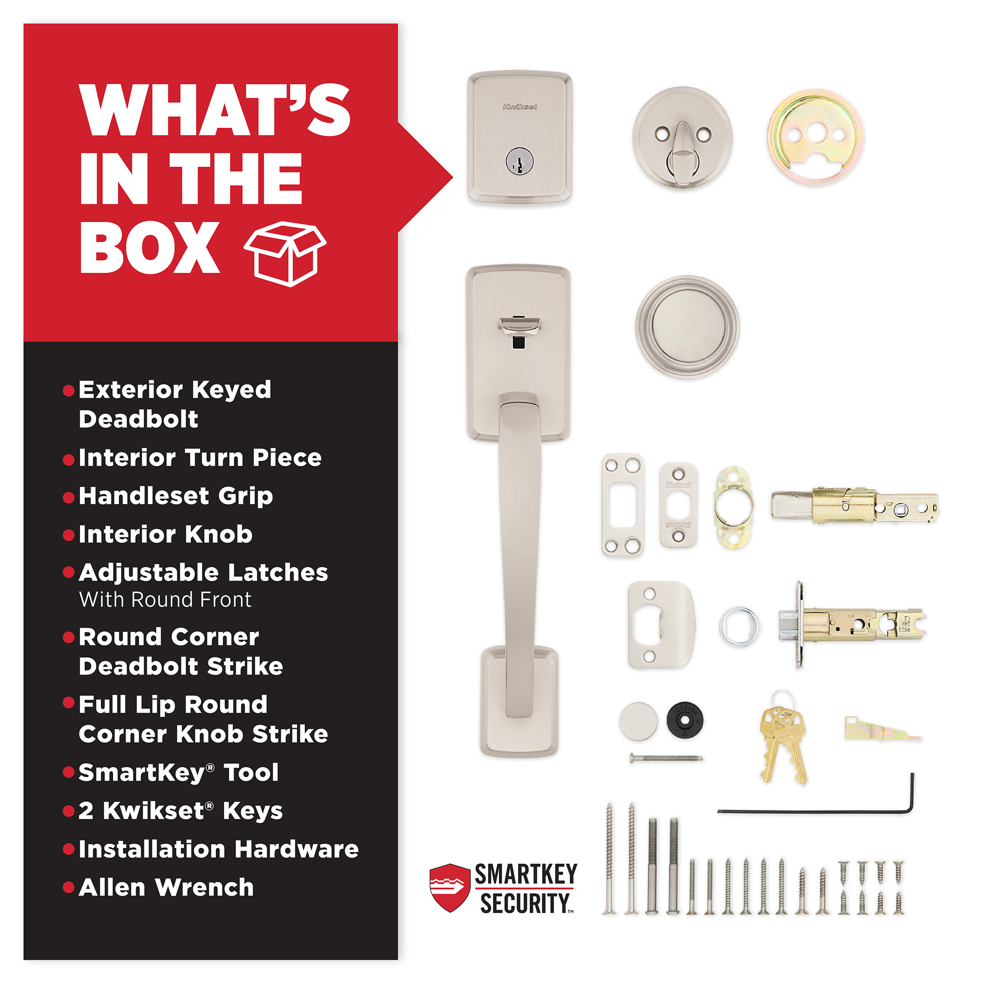 SmartKey Security™ re-key technology is compatible with Kwikset (KW1) keyway or (SC1) keyway options
