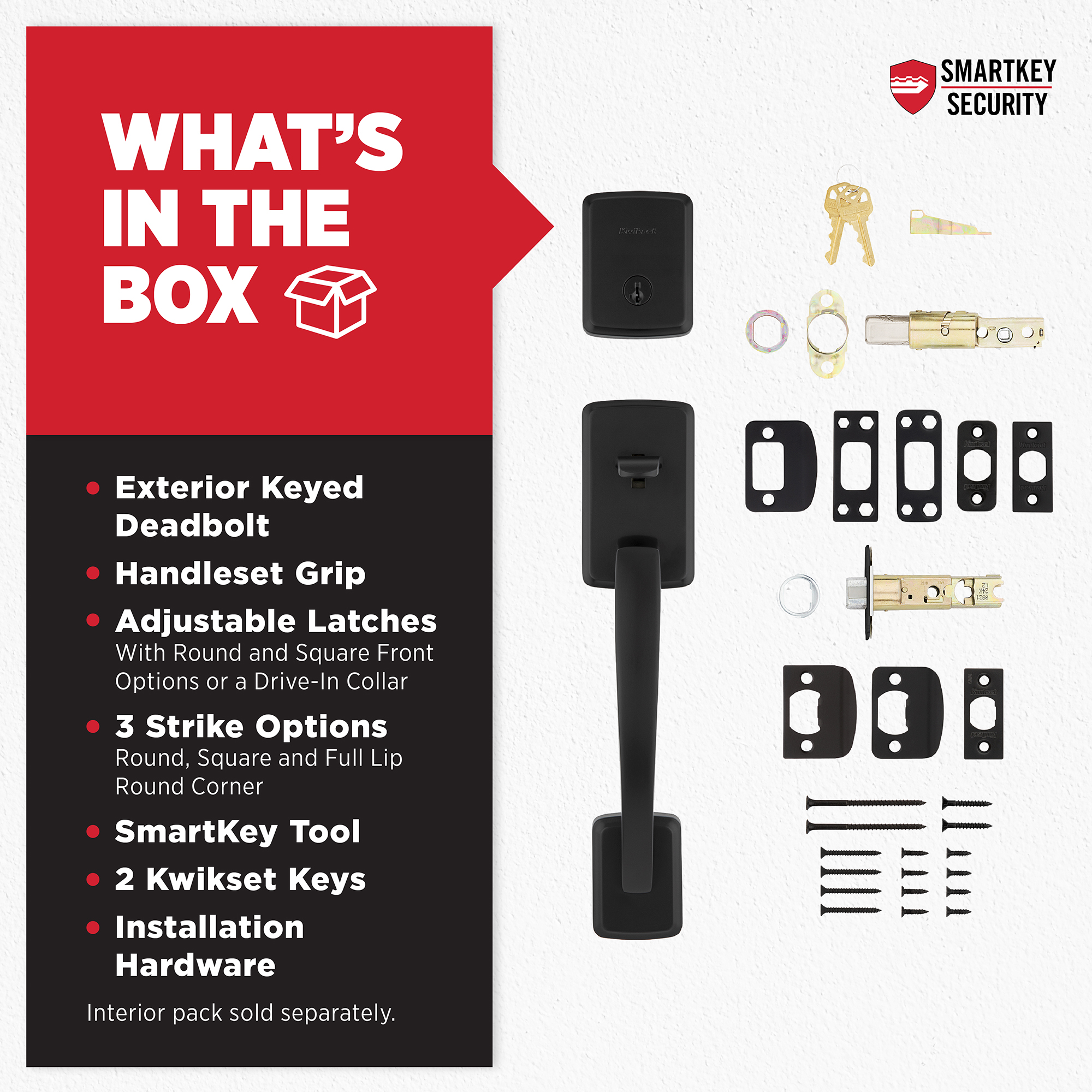 - Box Includes: Exterior Keyed Deadbolt, handleset, Adjustable Latches, strikes, SmartKeytool, 2 Kwikset keys and latch and strike installation hardware