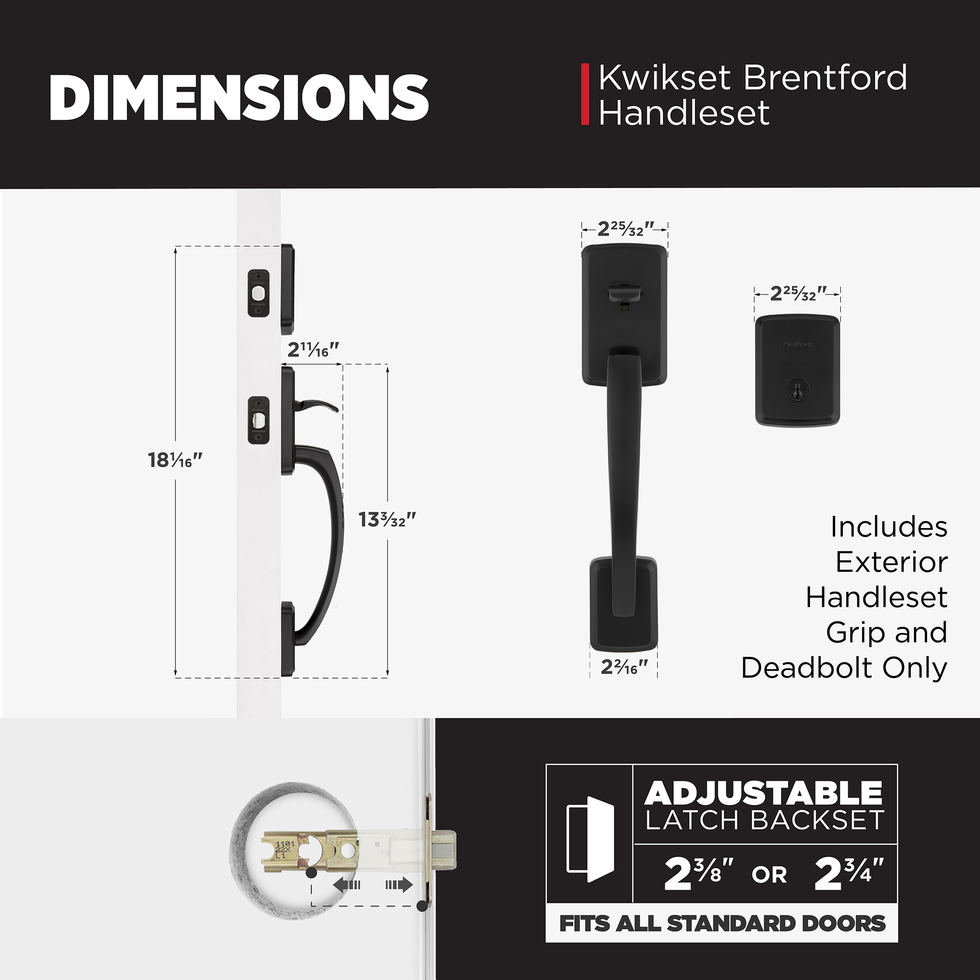 - Fits Standard Doors: Fits standard size doors 1-3/4" thick, latch backset adjusts to either 2-3/8" or 2-3/4" by sliding the adjustment pin during installation