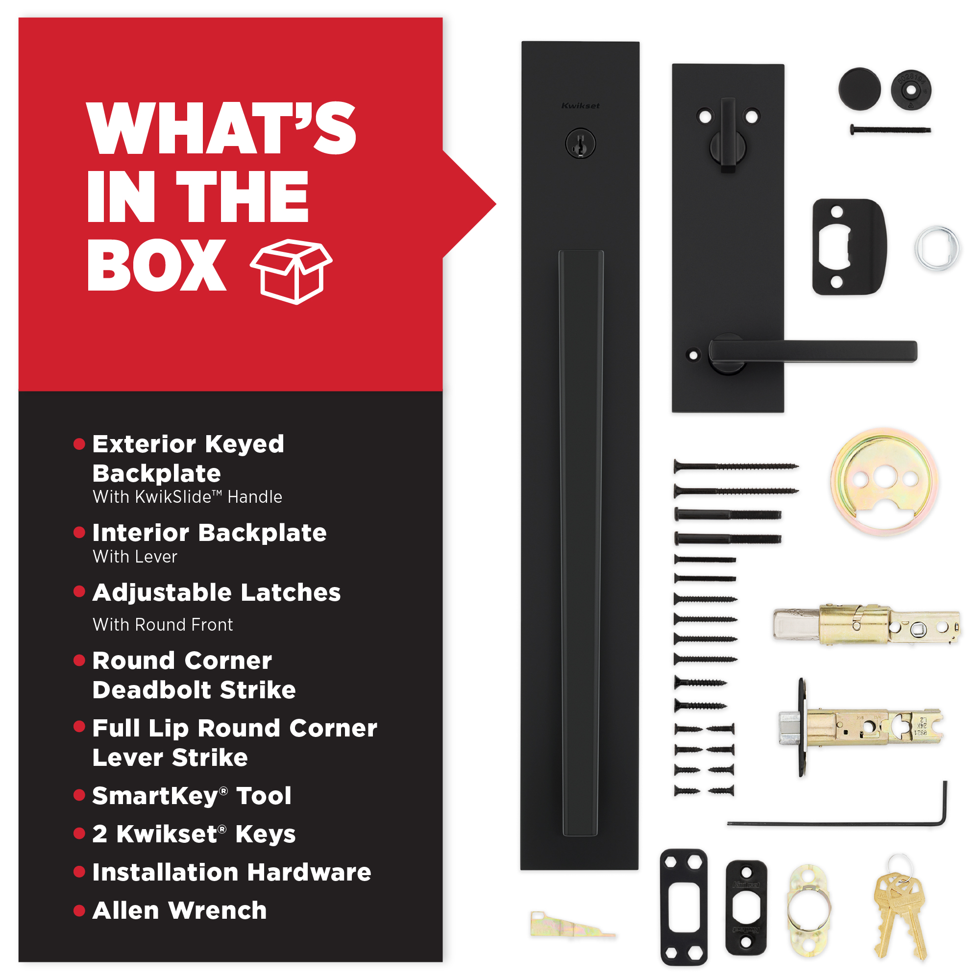 - Box Includes: Exterior keyed backplate with KwikSlide handle, interior backplate with lever, Adjustable Latches, strikes, SmartKey tool, 2 Kwikset keys, installation hardware and Allen wrench