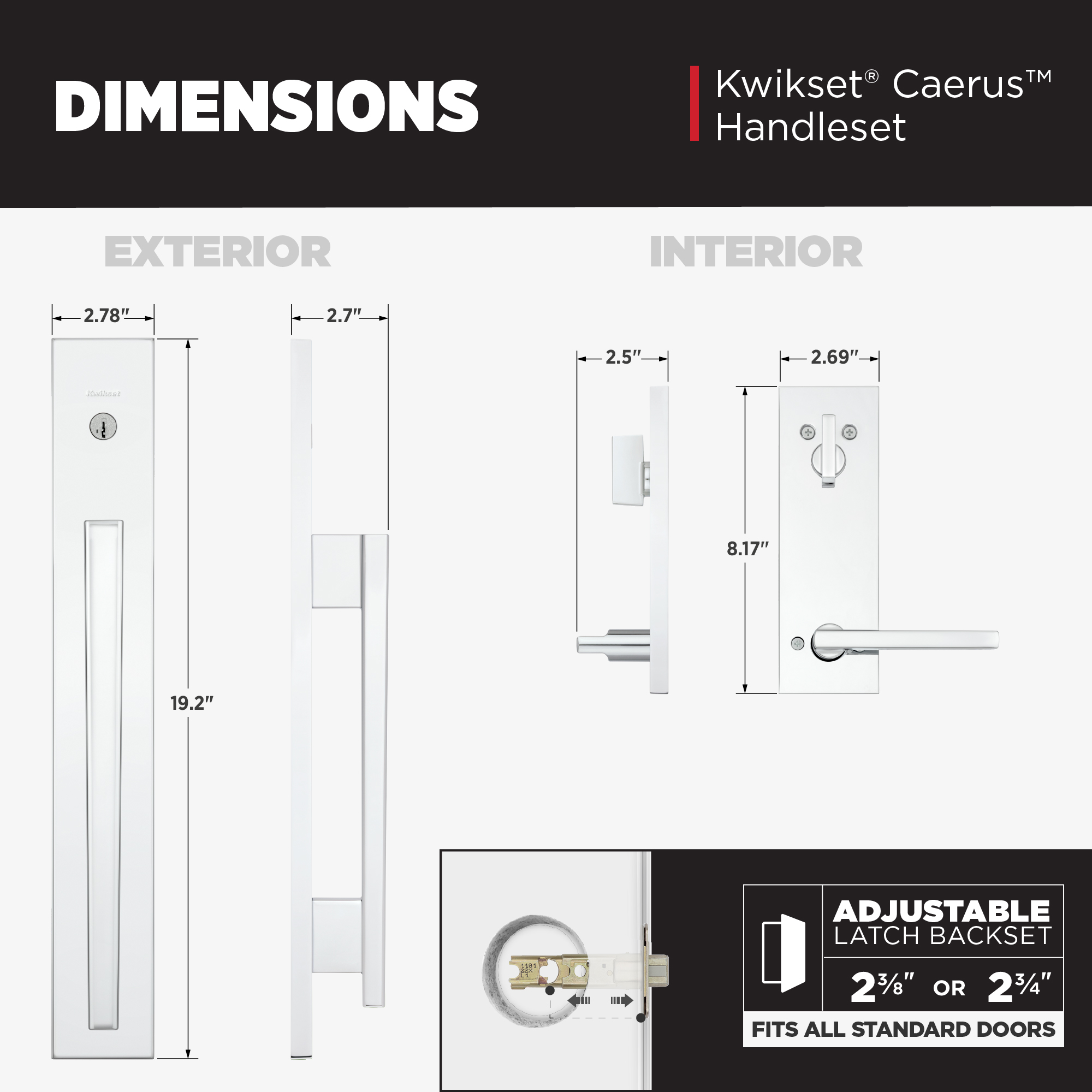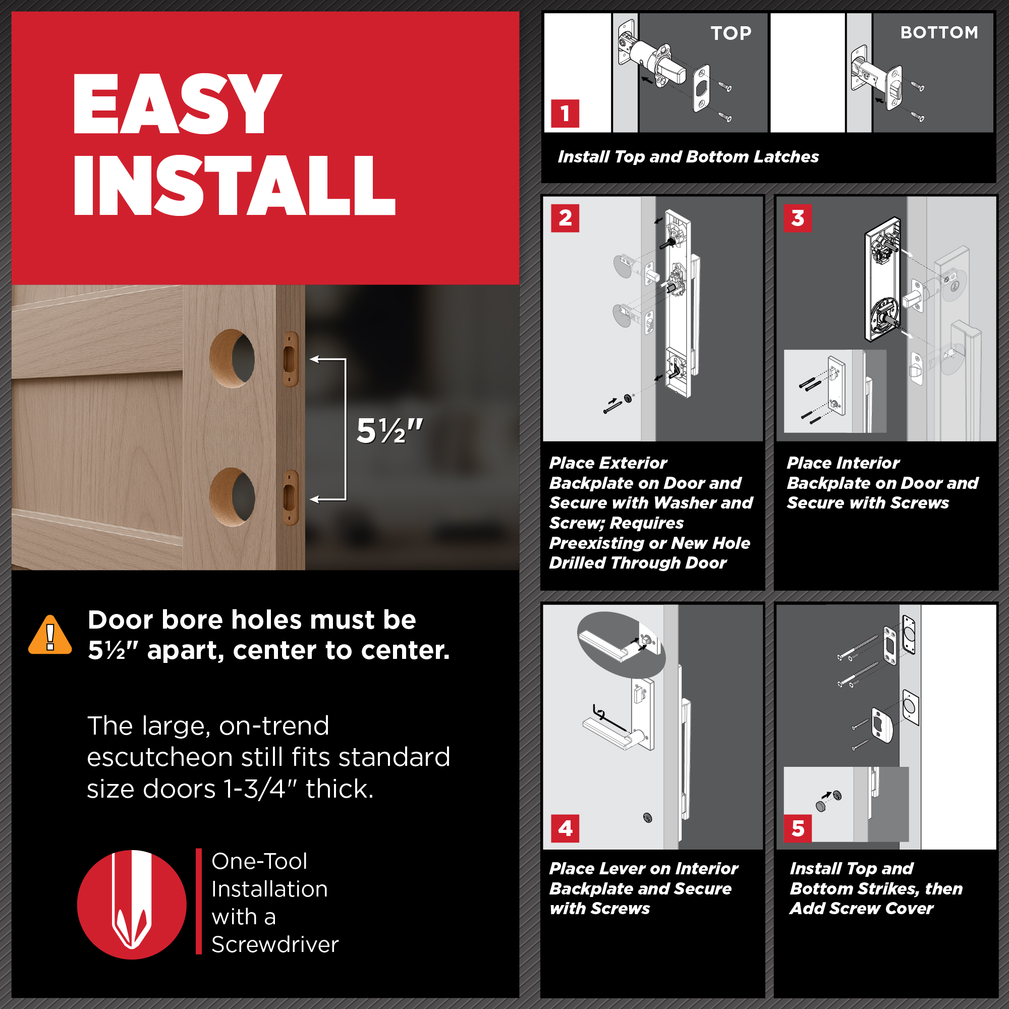 - Fits Standard Doors: The large escutcheon is designed to fit standard 1-3/4" thick doors out of the box and can accommodate doors up to 2-1/4" thick when used with a thick door kit. The required bore hole spacing is 5-1/2" center-to-center, and the latch backset is adjustable to either 2-3/8" or 2-3/4"