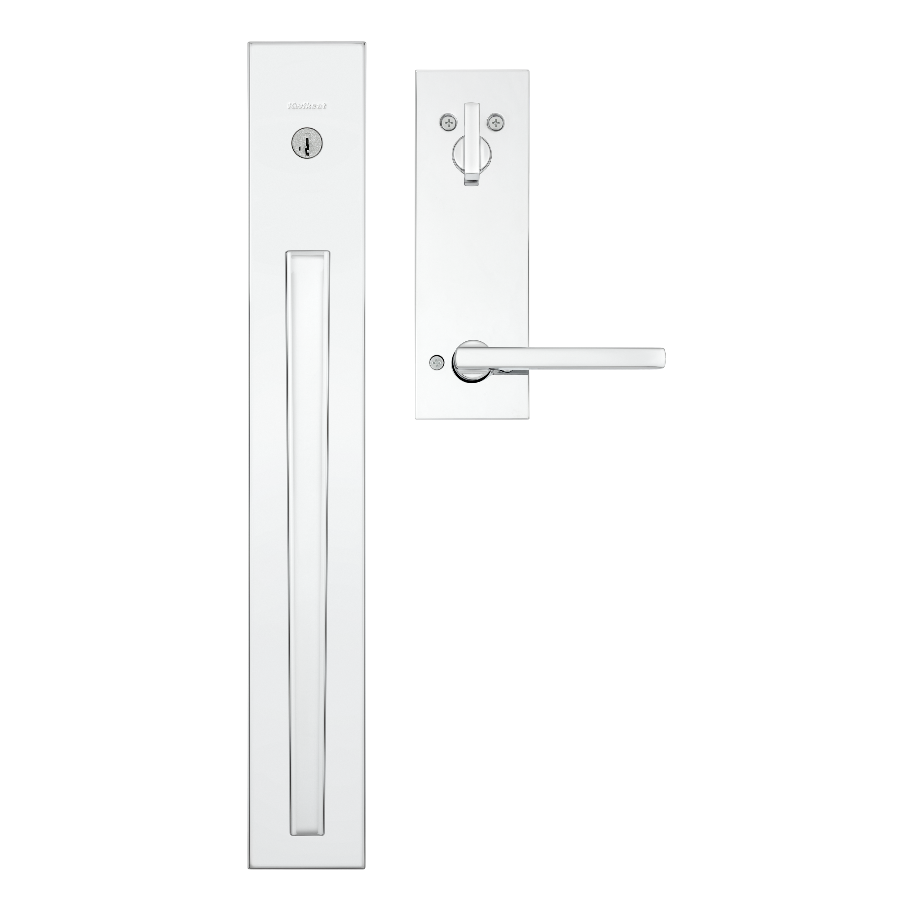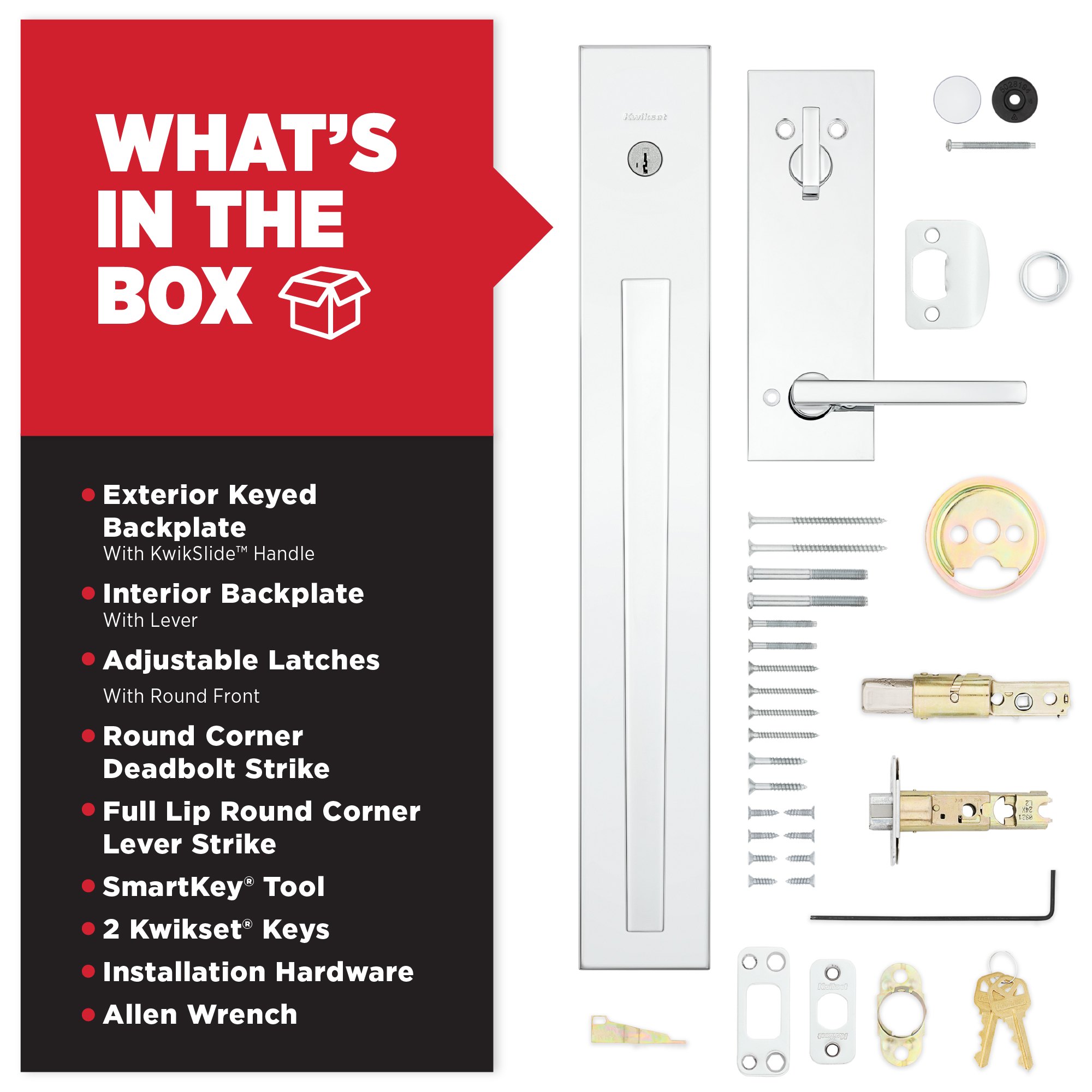 - Box Includes: Exterior keyed backplate with KwikSlide handle, interior backplate with lever, Adjustable Latches, strikes, SmartKey tool, 2 Kwikset keys, installation hardware and Allen wrench
