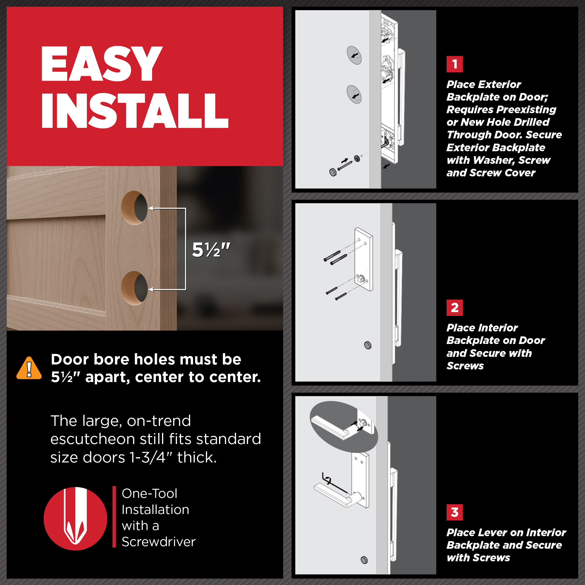 Easy Install: Do it yourself, installs in minutes with just a screwdriver, if your door doesn’t have a hole to support the handleset’s bottom connection point, you will need to drill a hole
