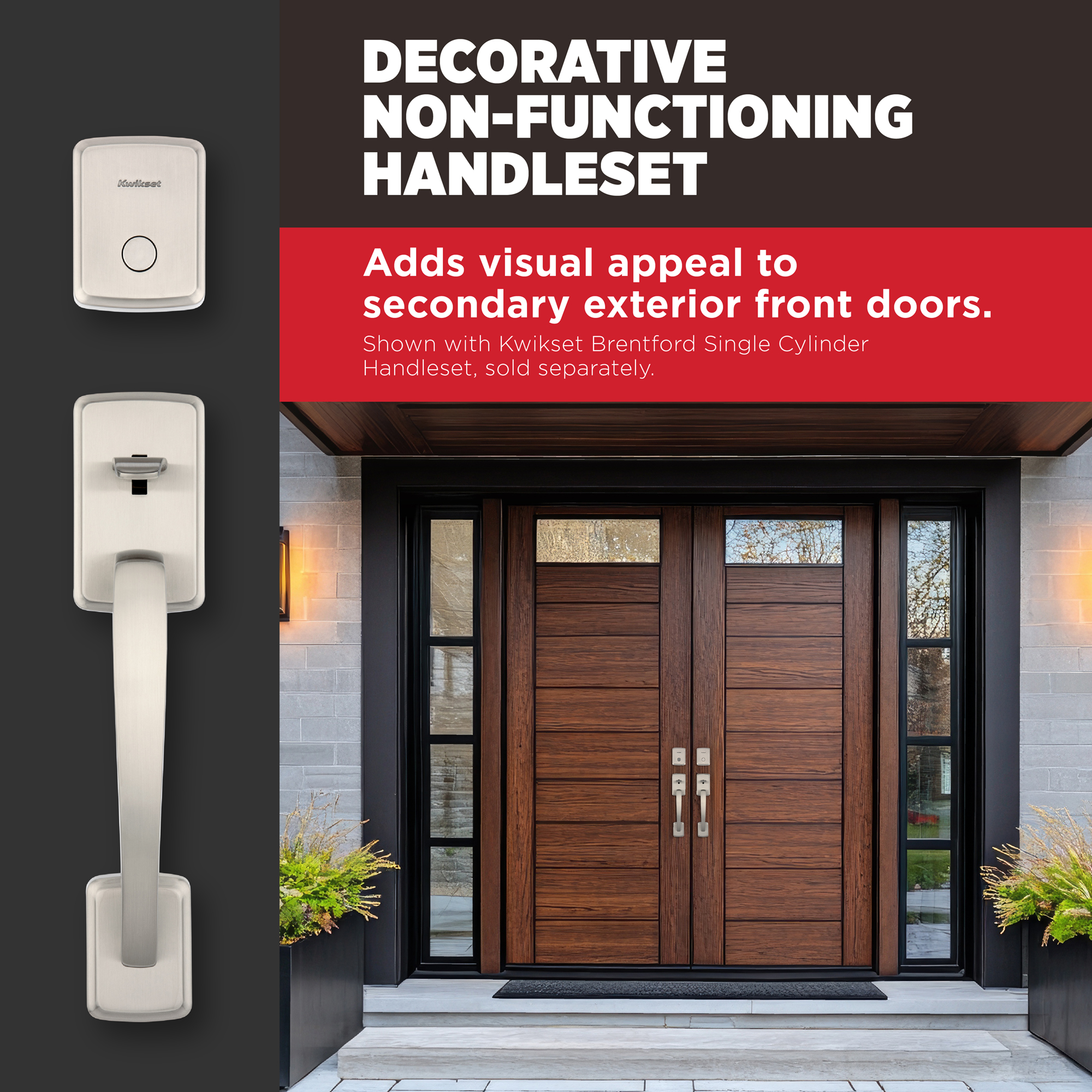 Decorative Non-Functioning Handleset: Adds visual appeal to secondary exterior front doors, pairs with the Kwikset Prescott keyed handleset (sold separately)