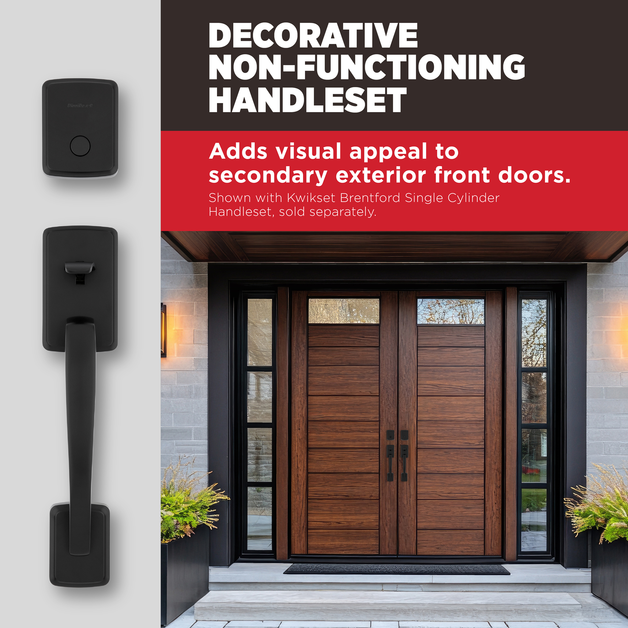 Decorative Non-Functioning Handleset: Adds visual appeal to secondary exterior front doors, pairs with the Kwikset Prescott keyed handleset (sold separately)