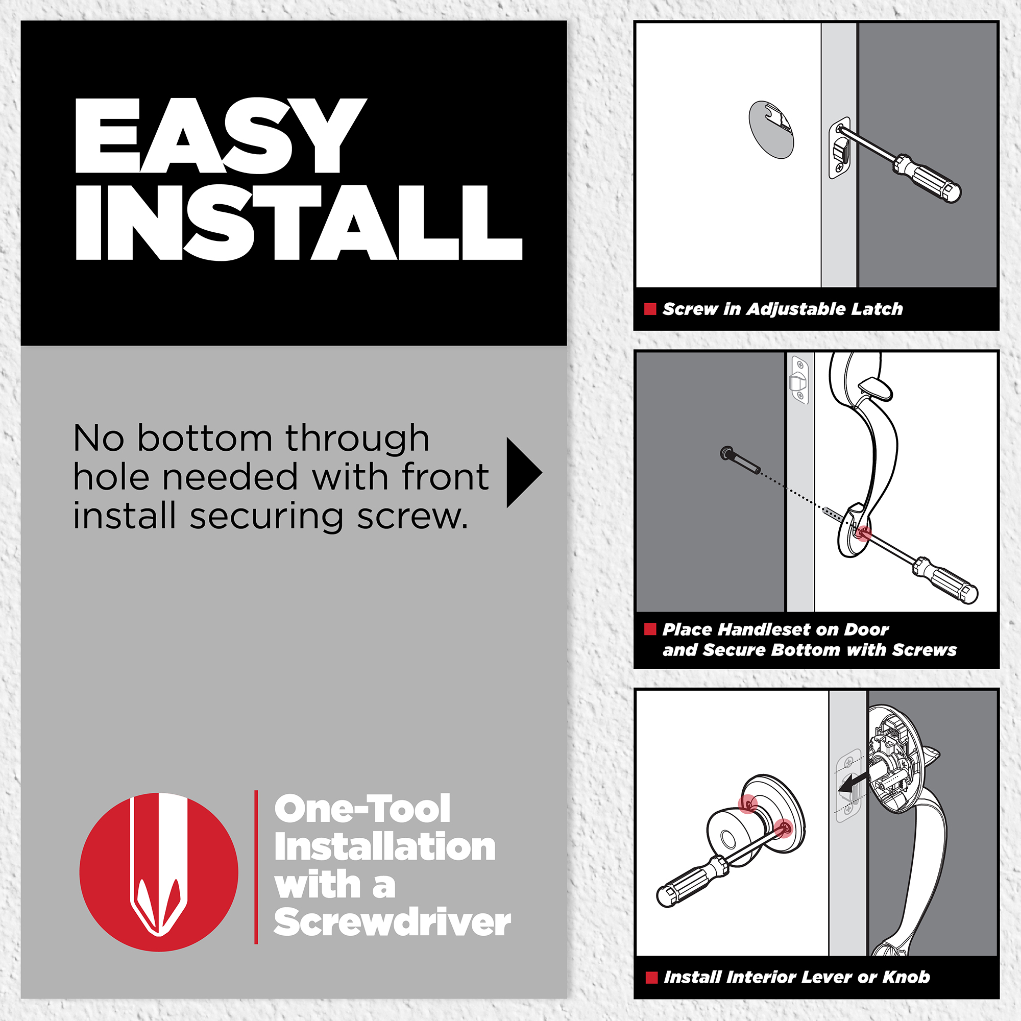 - Fits Standard Doors: Fits standard size doors 1-3/4" thick, latch backset adjusts to either 2-3/8" or 2-3/4" by sliding the adjustment pin during installation
