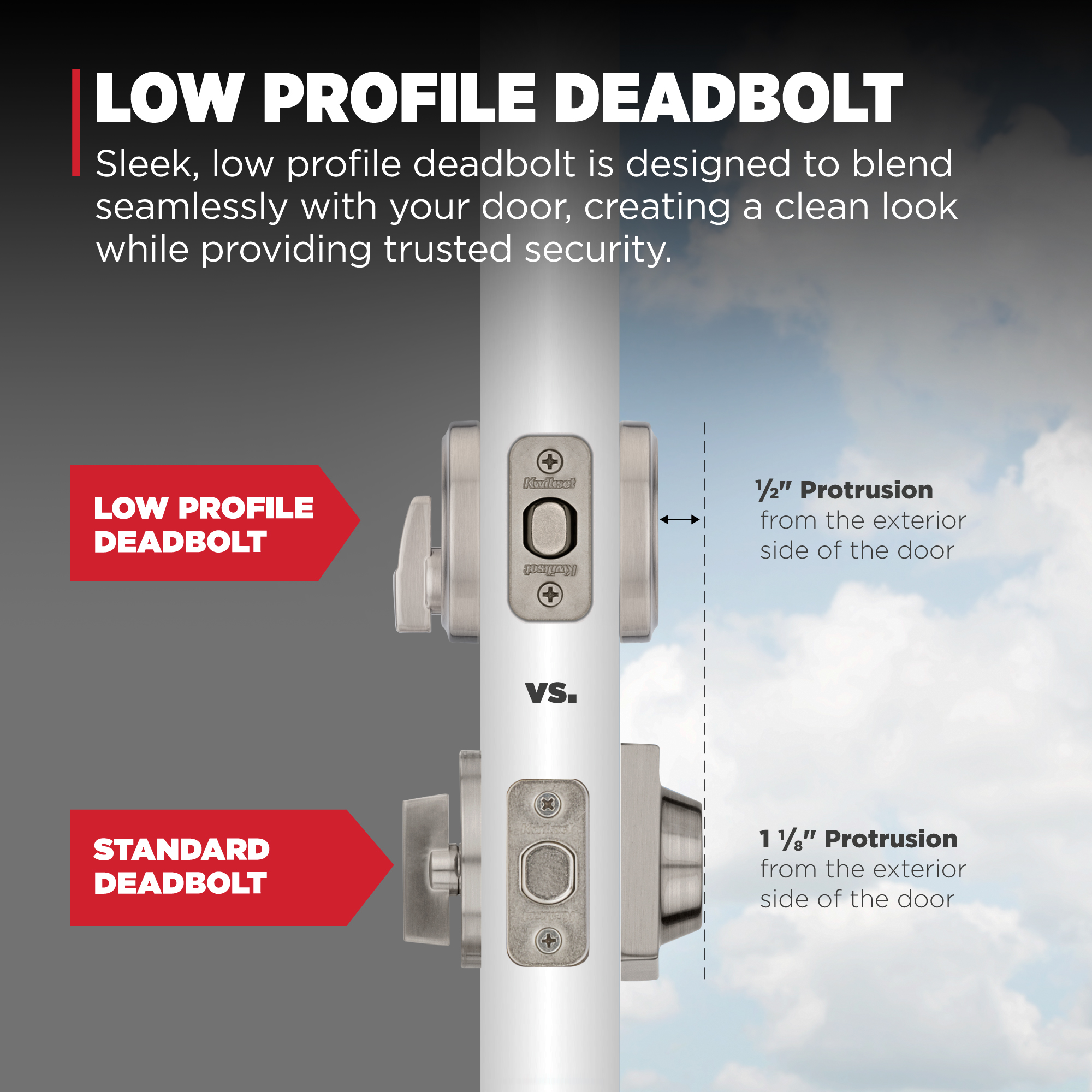 - Low Profile Deadbolt: Sleek, Low Profile Deadbolt is designed to blend seamlessly withyour door, creating a clean look while providing the same trusted security as a standarddeadbolt