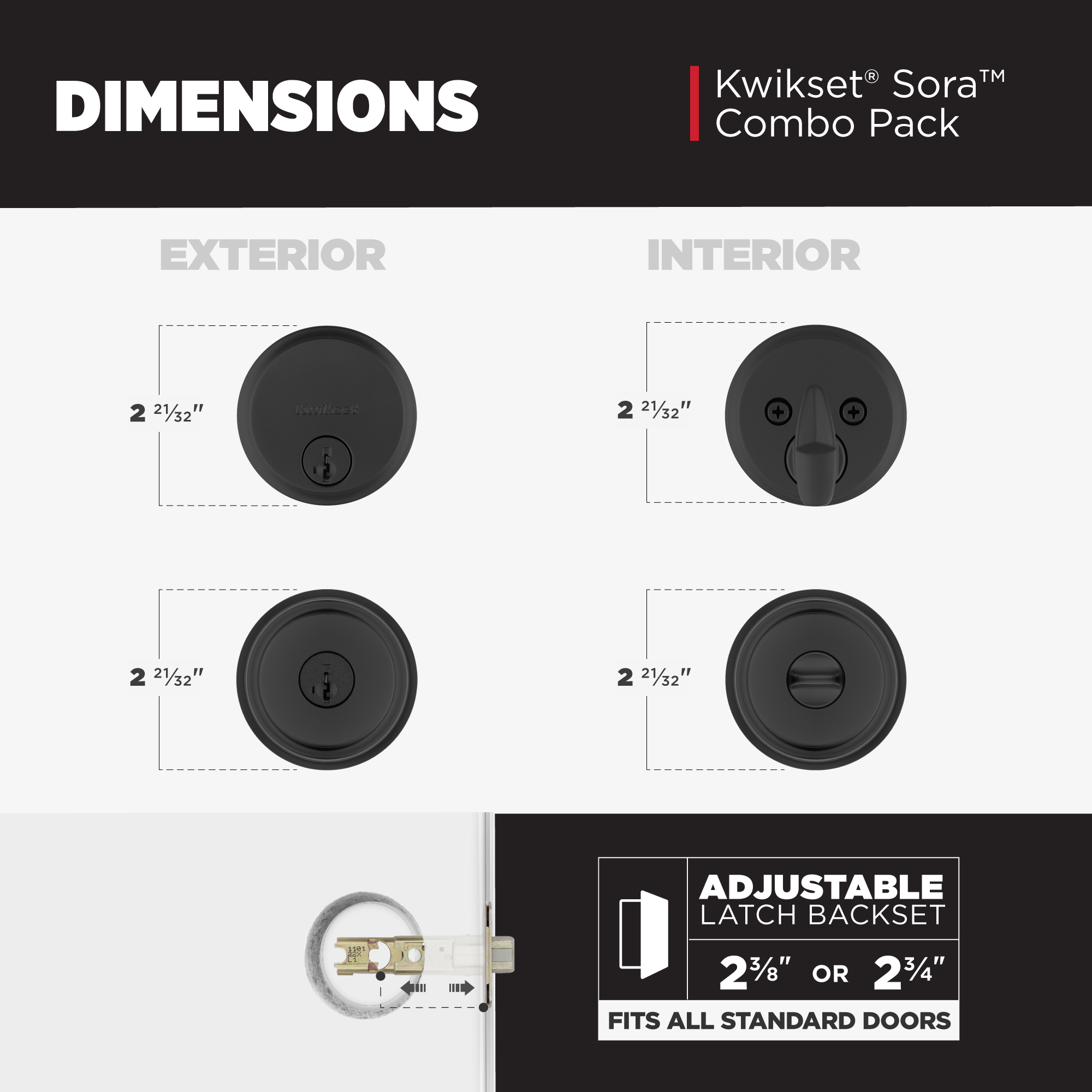 - Fits Standard Doors: Fits standard size doors 1-3/8" to 1-3/4" thick, latch backset adjuststo either 2-3/8" or 2-3/4" with just a twist during installation