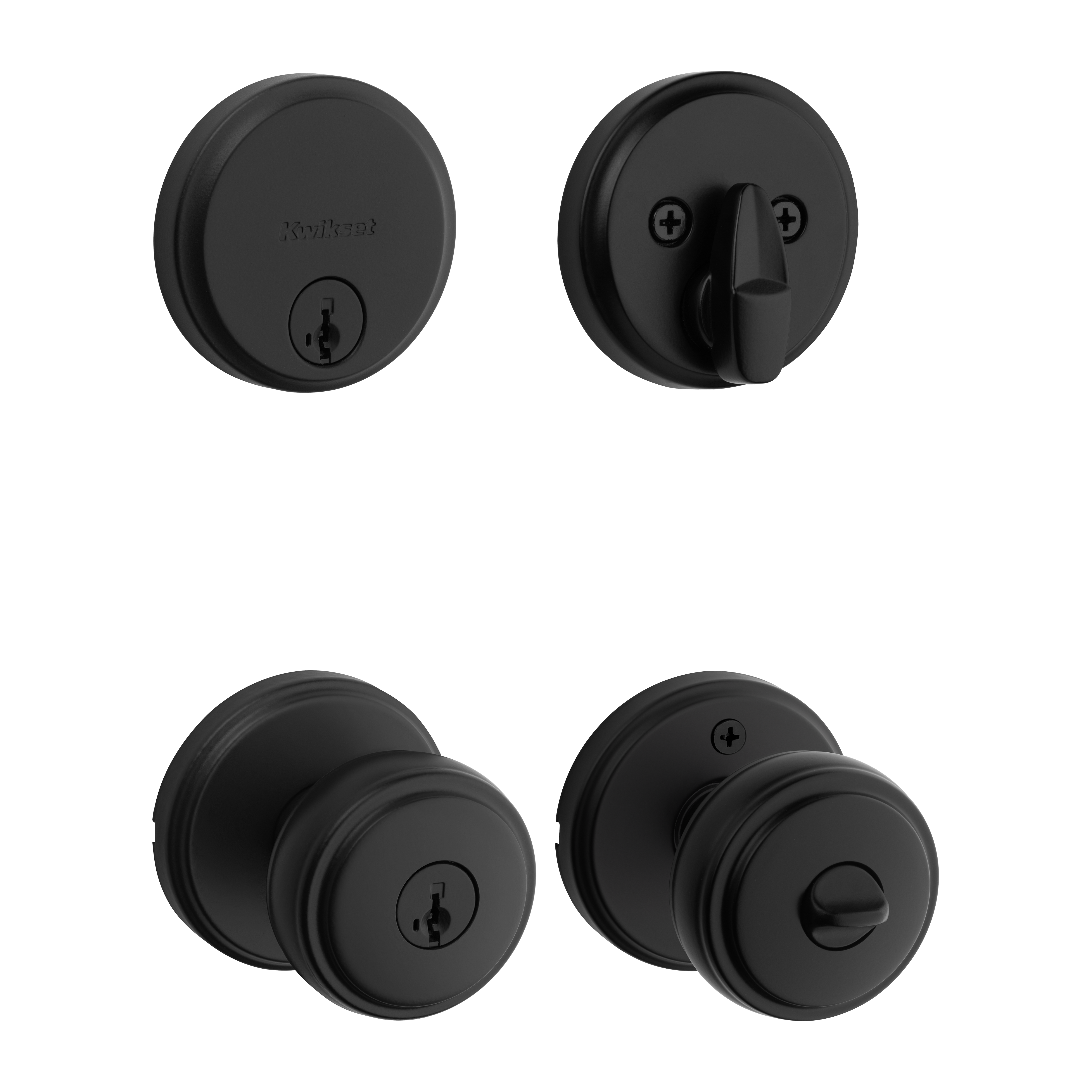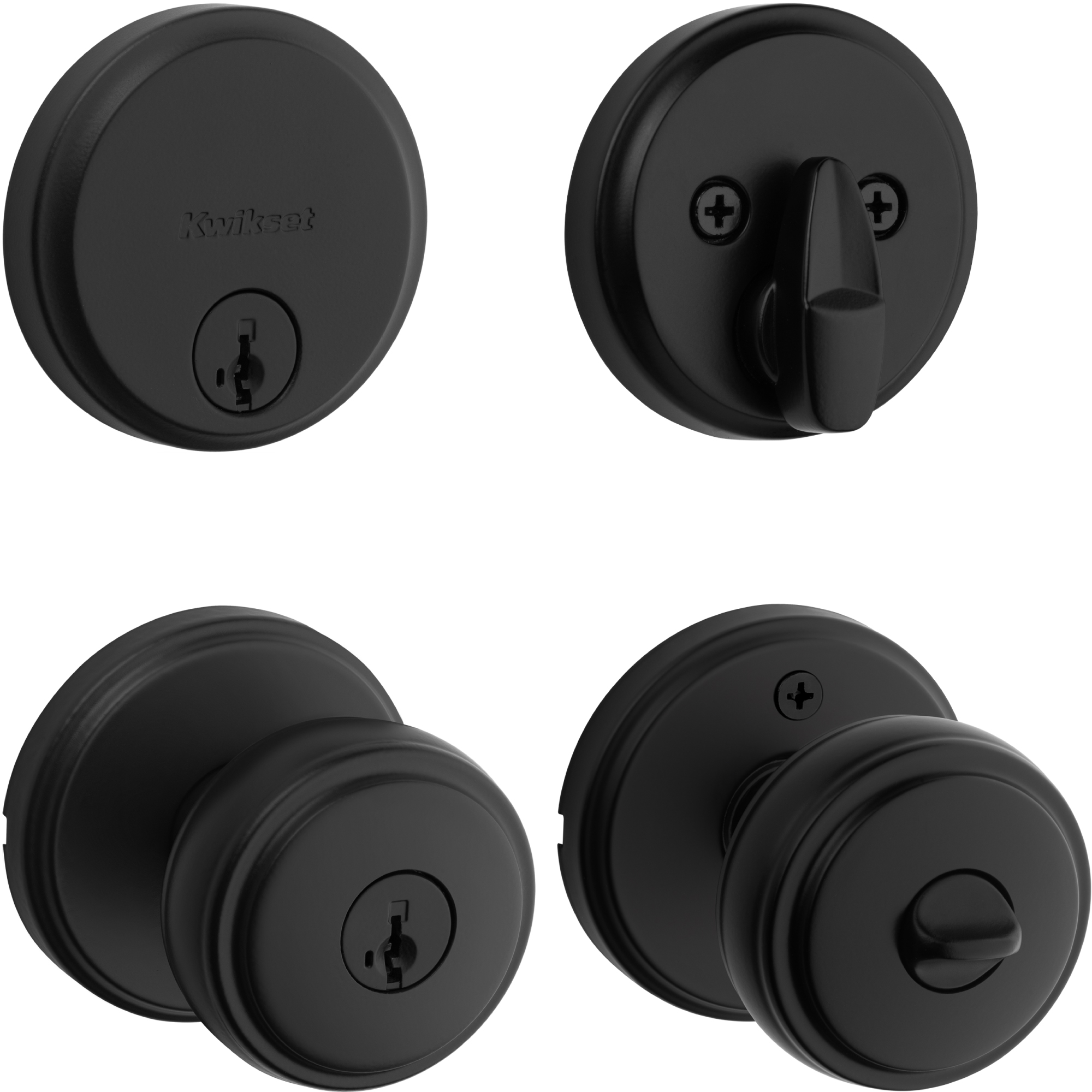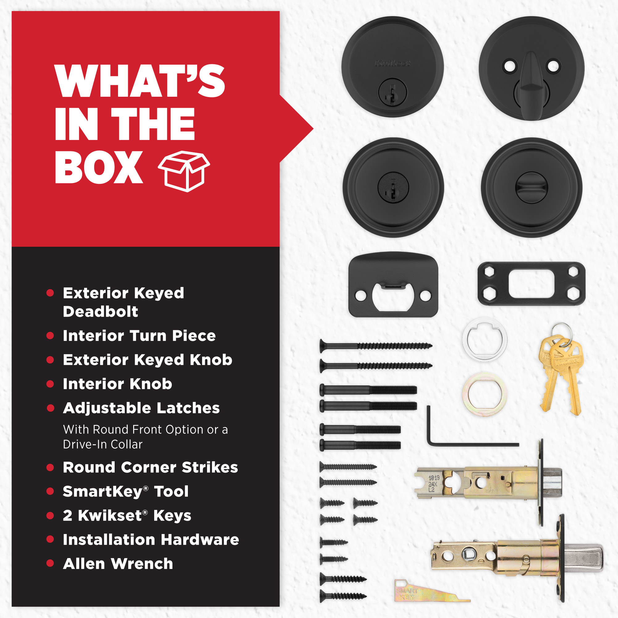 - Box Includes: Exterior Keyed Deadbolt, interior turn piece, exterior keyed knob, interiorknob, Adjustable Latches, strikes, SmartKey tool, 2 Kwikset keys, installation hardware andAllen wrench